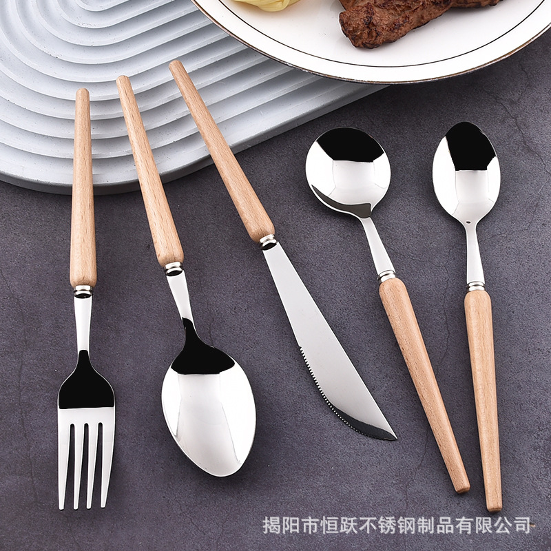 ブナ材先端ハンドル食器 304 ステンレス鋼のナイフ、フォーク、スプーンセット先端西洋食器ナイフ、スプーン、フォーク