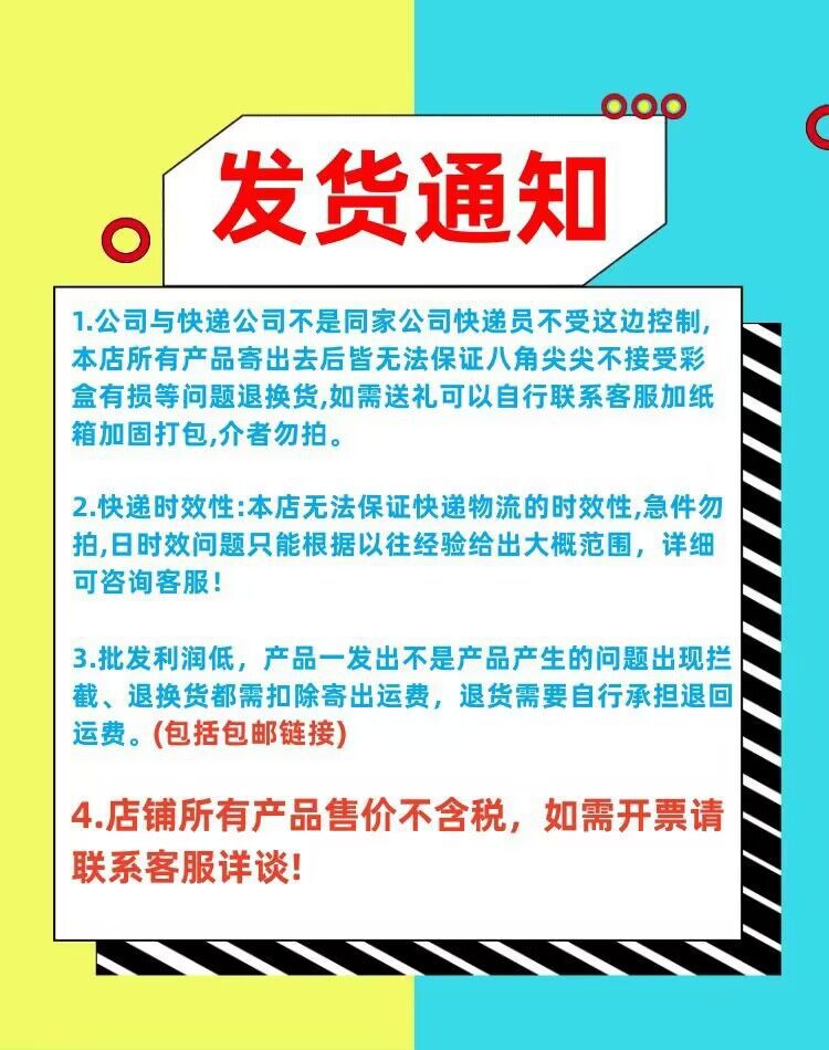 产品质量:所发产品均会通过产中、产后、发出前等多次检查,完全合格才发货,但各种不确定因素均会导致产品功能的丧失,我司只能保证98%的合格率,2%属免责范围。图片与实物:产品图片95%以上均为自拍,比较能真实的反映产品本身的实际,但因光线,拍摄水平等因素可能会导致图片和实物略有差异。因市场变化等因素工厂可能会调整产品及外包装的颜色、包装方式等,请以实际为准