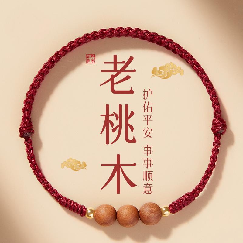 馬年(うまねつ)の干支年、桃の木の手編み赤い紐のブレスレット、護身木製のお守り、運気を高めるビーズ、手編みギフト
