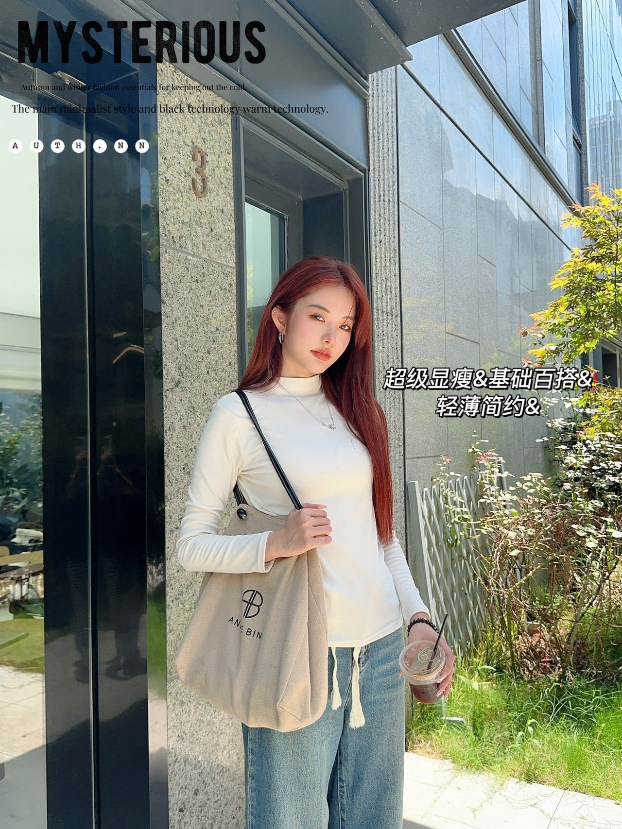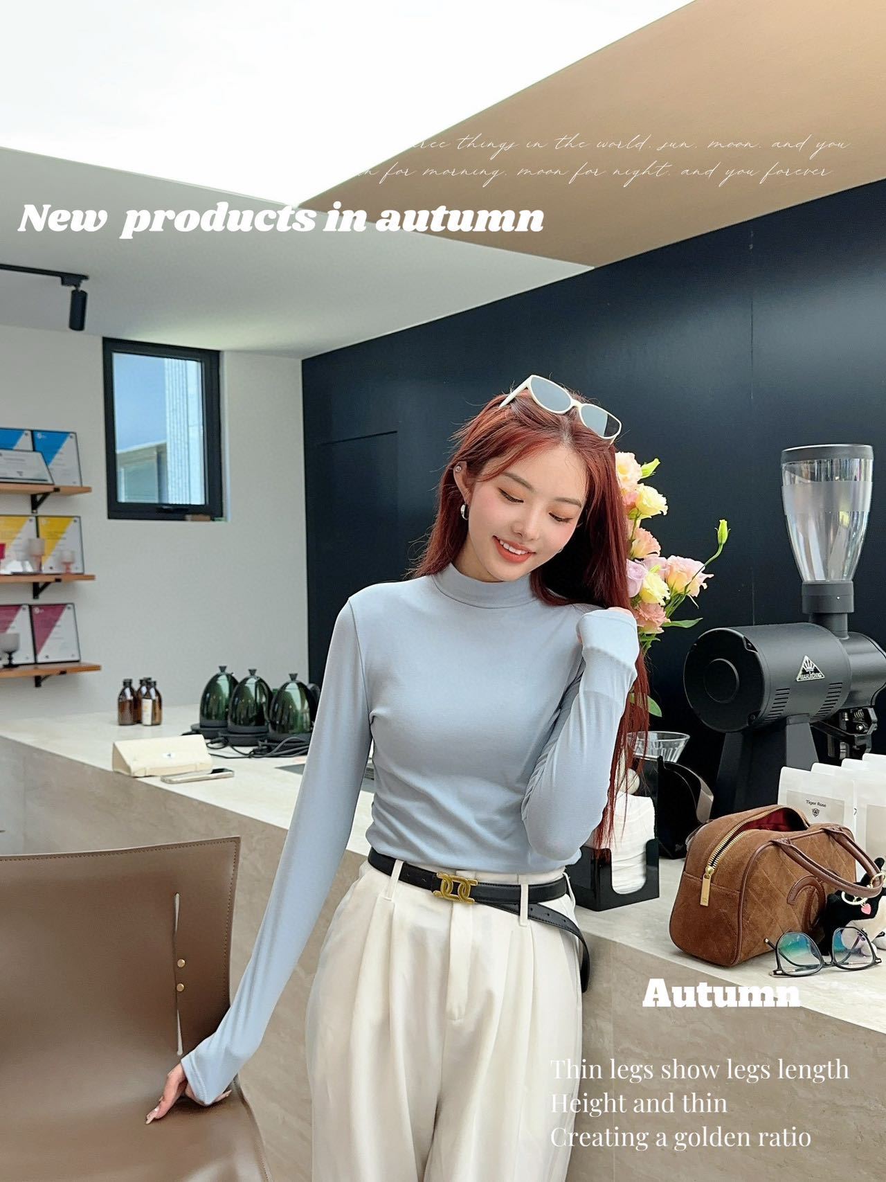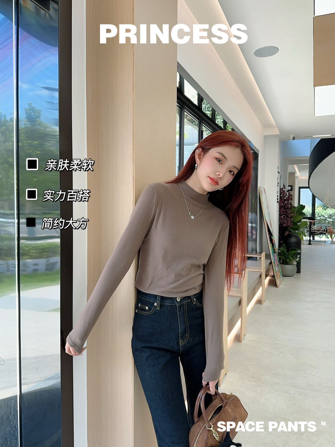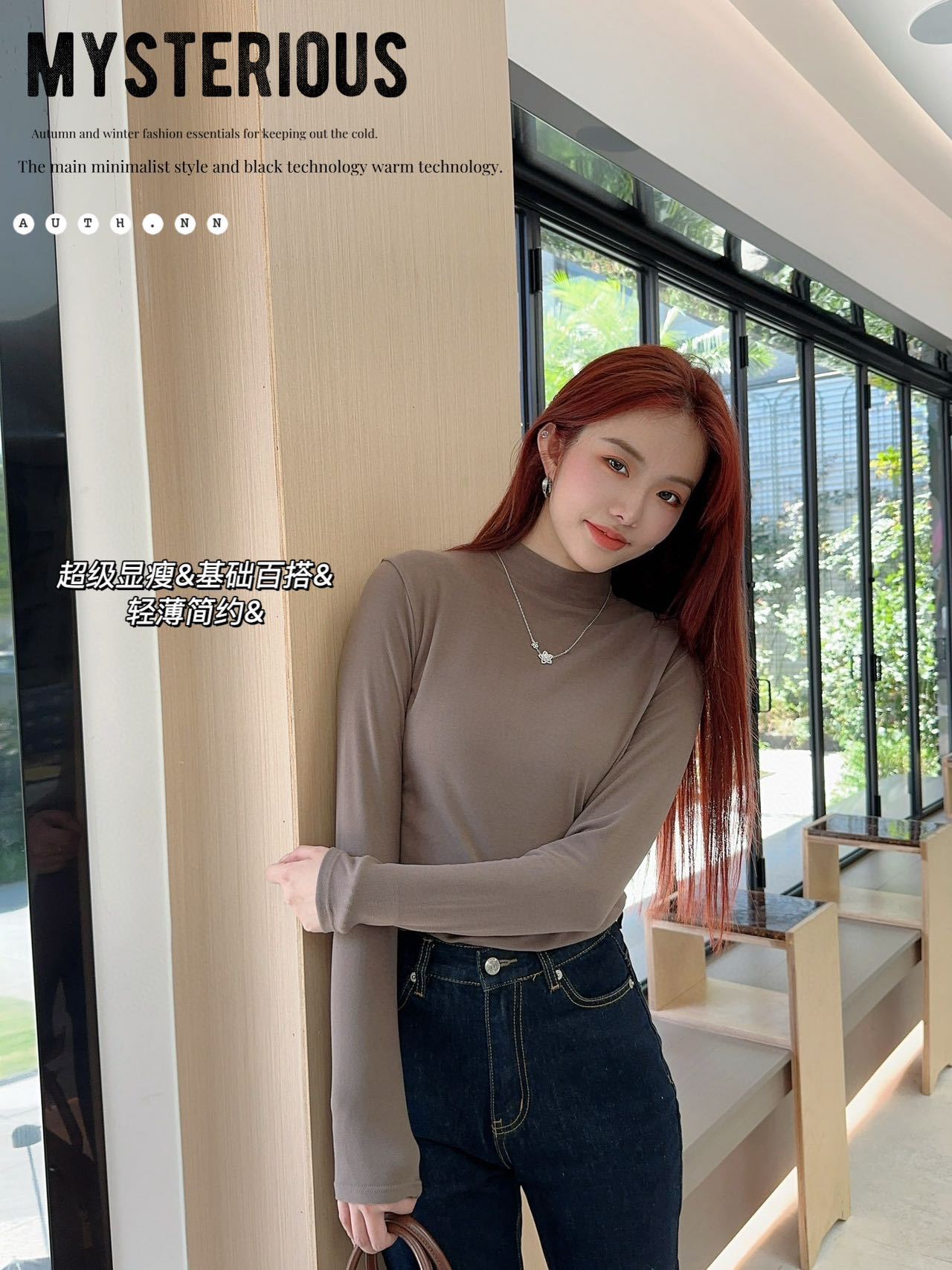 ハーフタートルネックマスク対応インナーシャツ ミルクシルク肌に優しい高伸縮性スリムフィット長袖トップス 秋冬文芸レトロ風万能スタイル