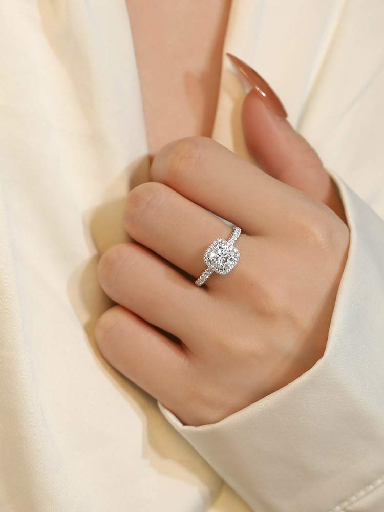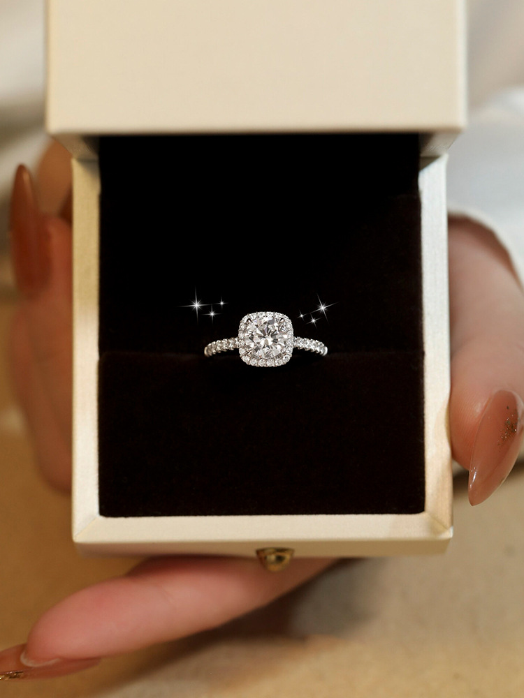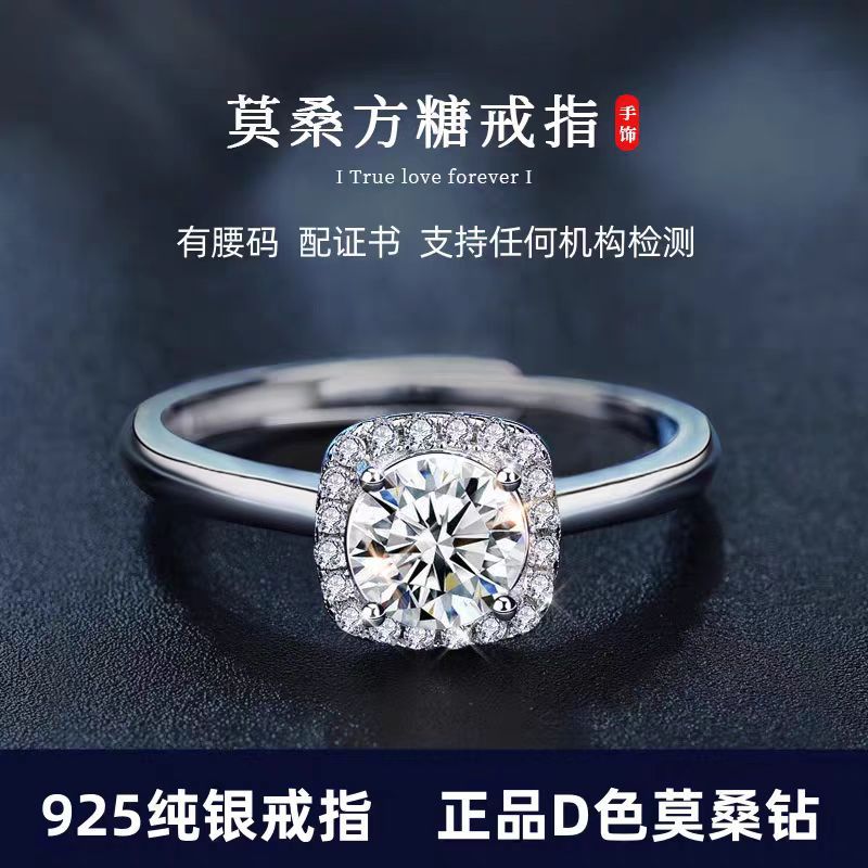 S925银一克拉莫桑钻戒指小方糖小众高级感几何方包银饰开口可调节