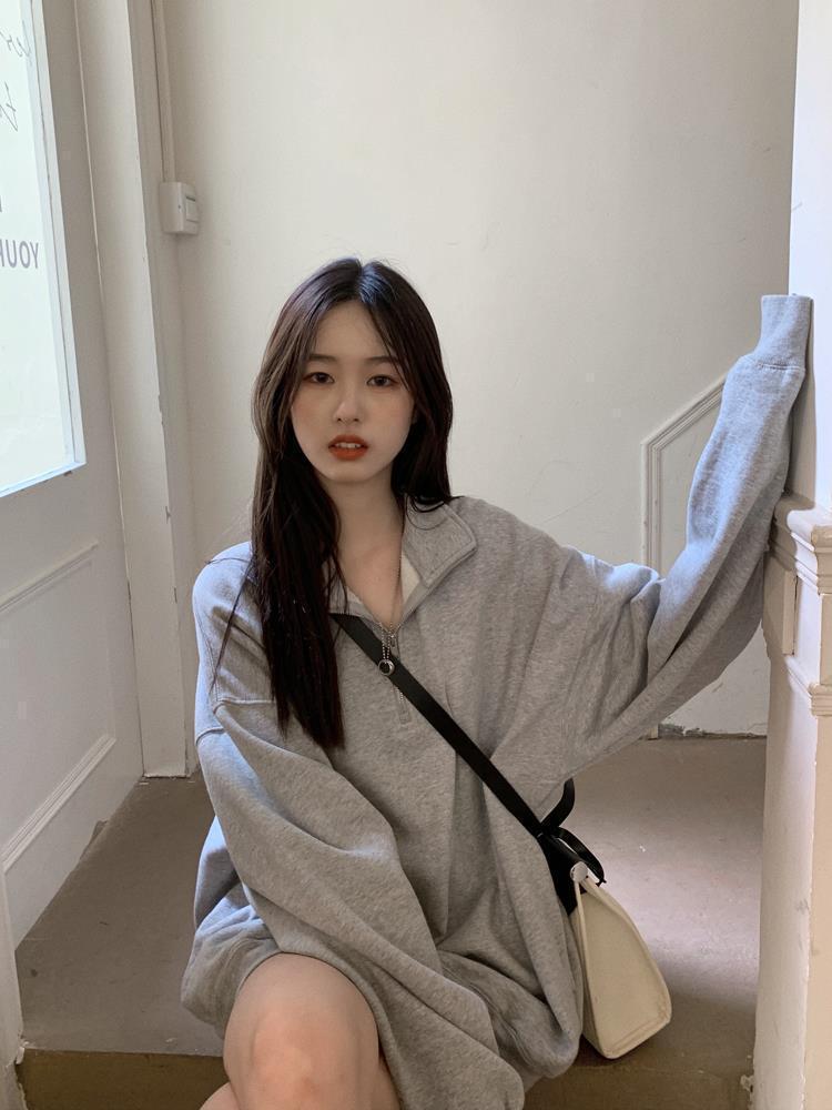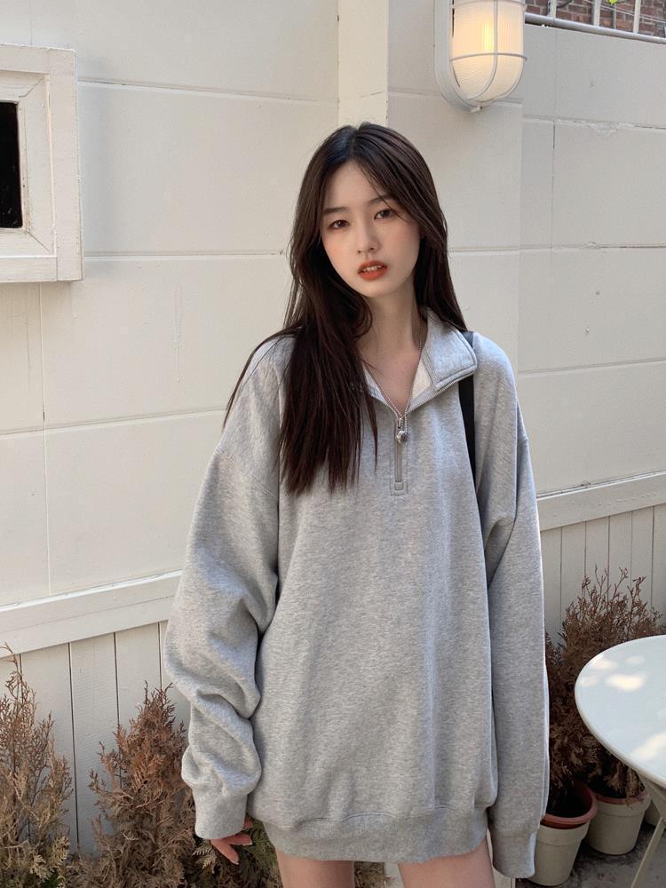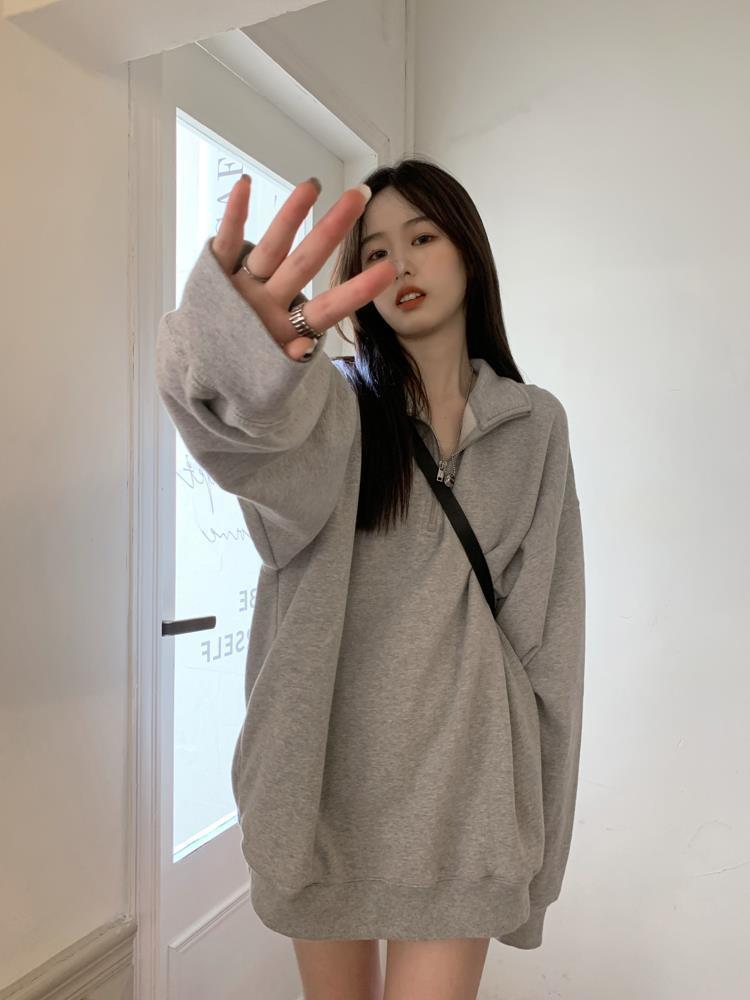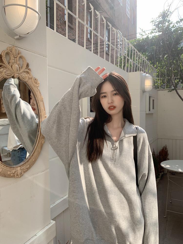 学生のアメリカの灰色の半ファスナーの衛衣の女子学生の春秋のoversizeはゆったりしています。