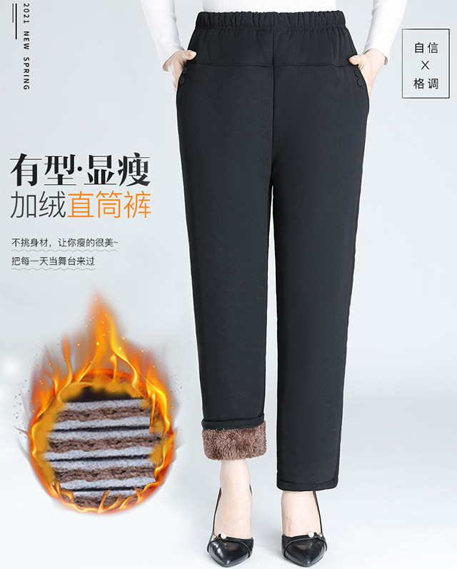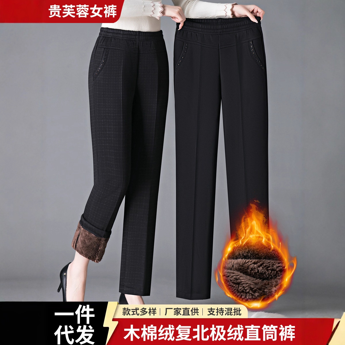中高年の女性のズボンの秋冬のベルベットの厚いストレートのズボンの中年のお母さんの新型は腰の高い女性のカジュアルなズボンを緩めます。