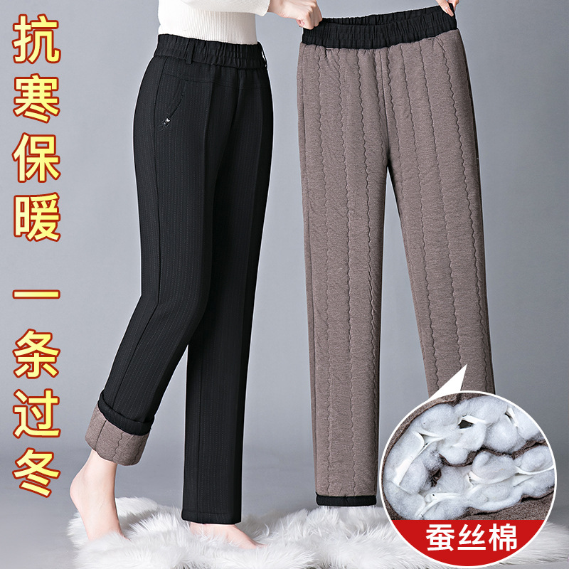 蚕丝棉裤女冬季中老年妈妈加绒加厚高腰保暖夹棉直筒外穿休闲裤子