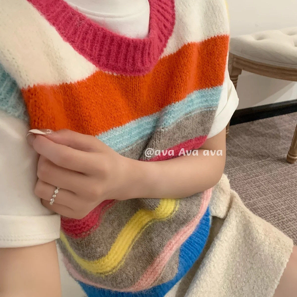 法式彩色条纹工字无袖打底马甲针织背心外穿女内搭上衣宽肩带坎肩
