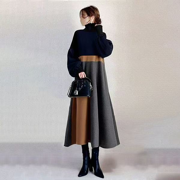 2025年春秋新作、ハイネックカラーブロックデザインのフェイクツーピースロングウールワンピース、好評発売中