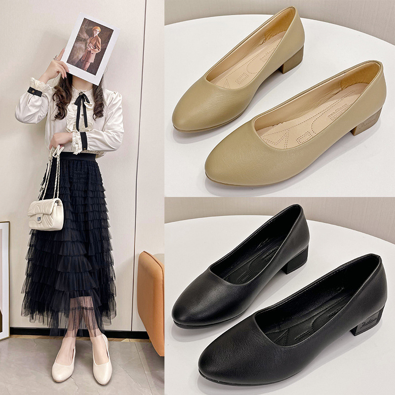 2024 春と夏の日本と韓国のスクエアトゥローヒールフラットレトロおばさん靴無地の女性の靴インターネット有名人の同じスタイル快適