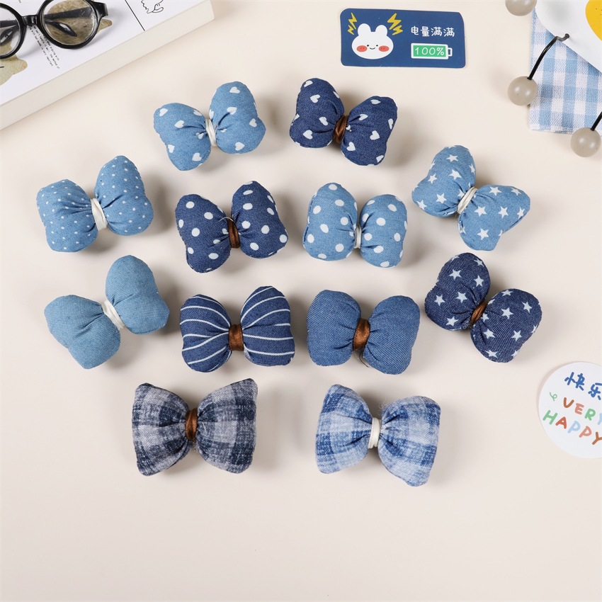 新款diy布艺蝴蝶结牛仔蓝波点爱心立体领结手工发饰材料服装辅料