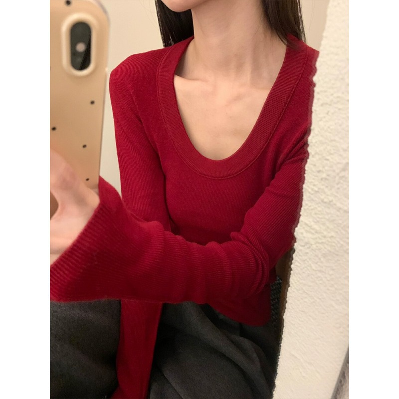 新年红色U领羊毛针织打底衫内搭女秋冬季高级感修身正肩长袖上衣