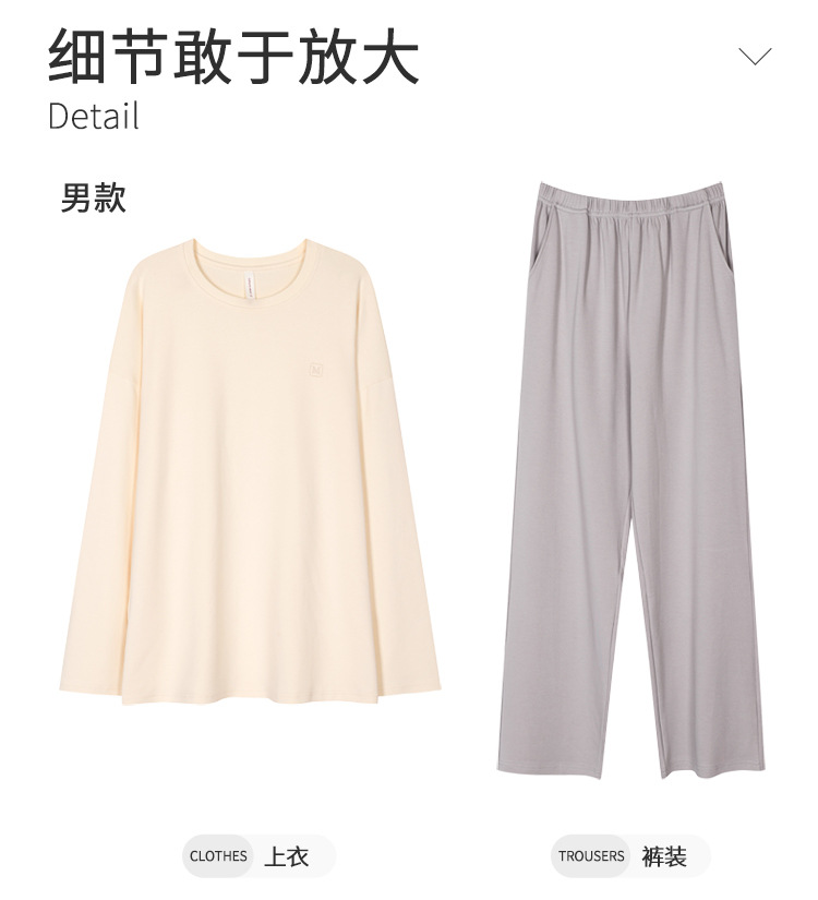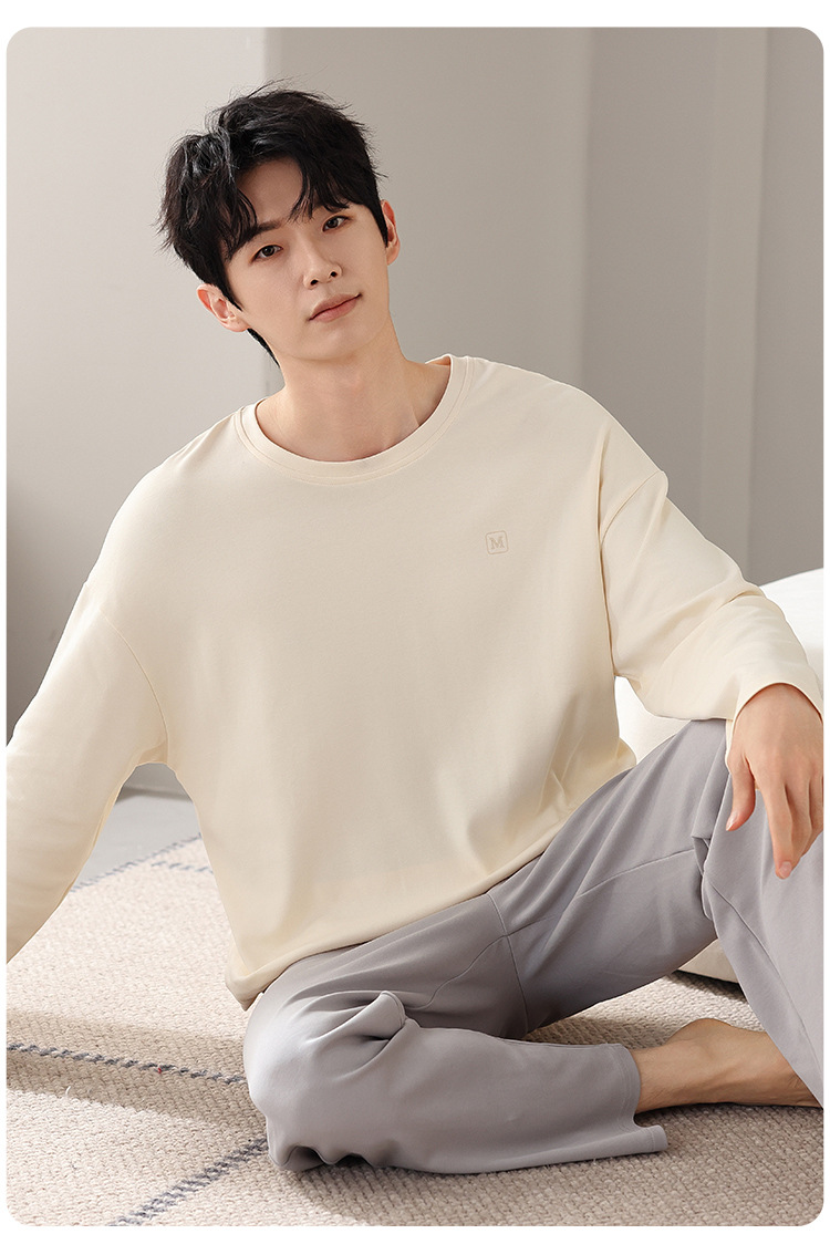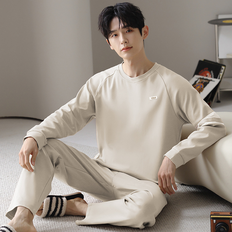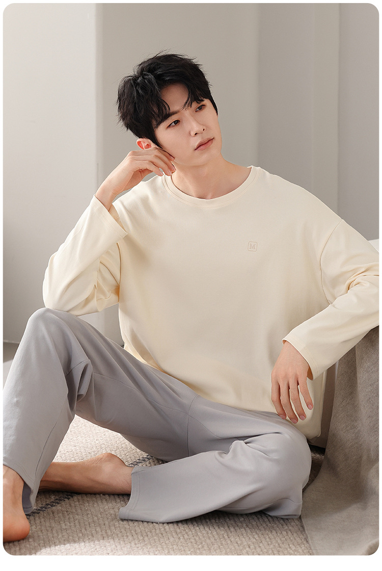 紧密纯棉睡衣男春秋季长袖长裤简约休闲风纯色男士大码家居服套装