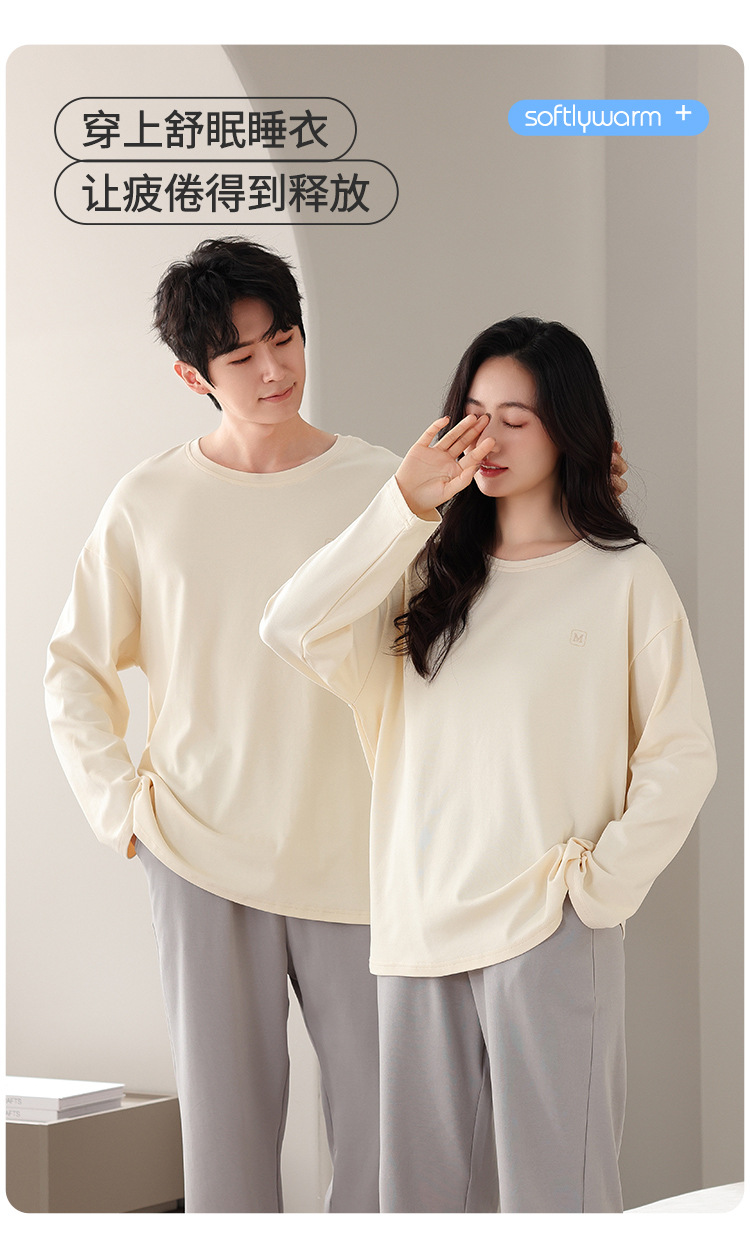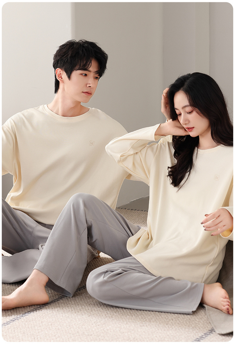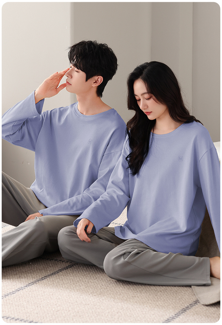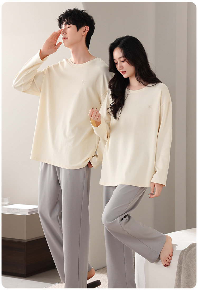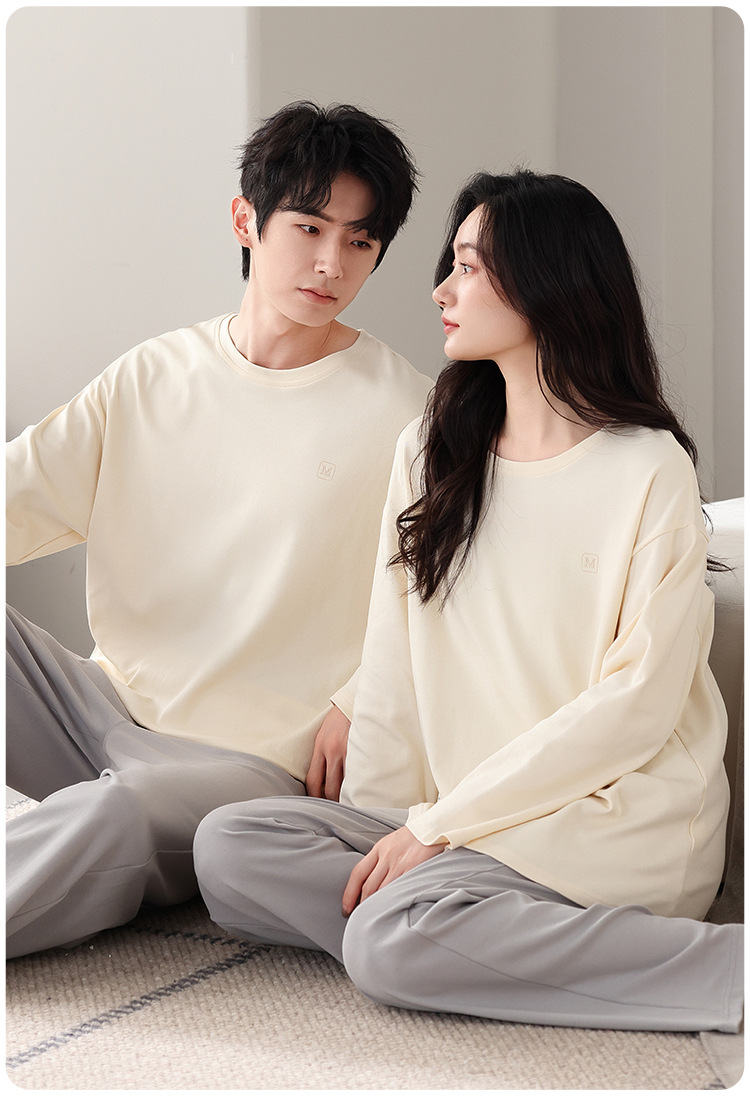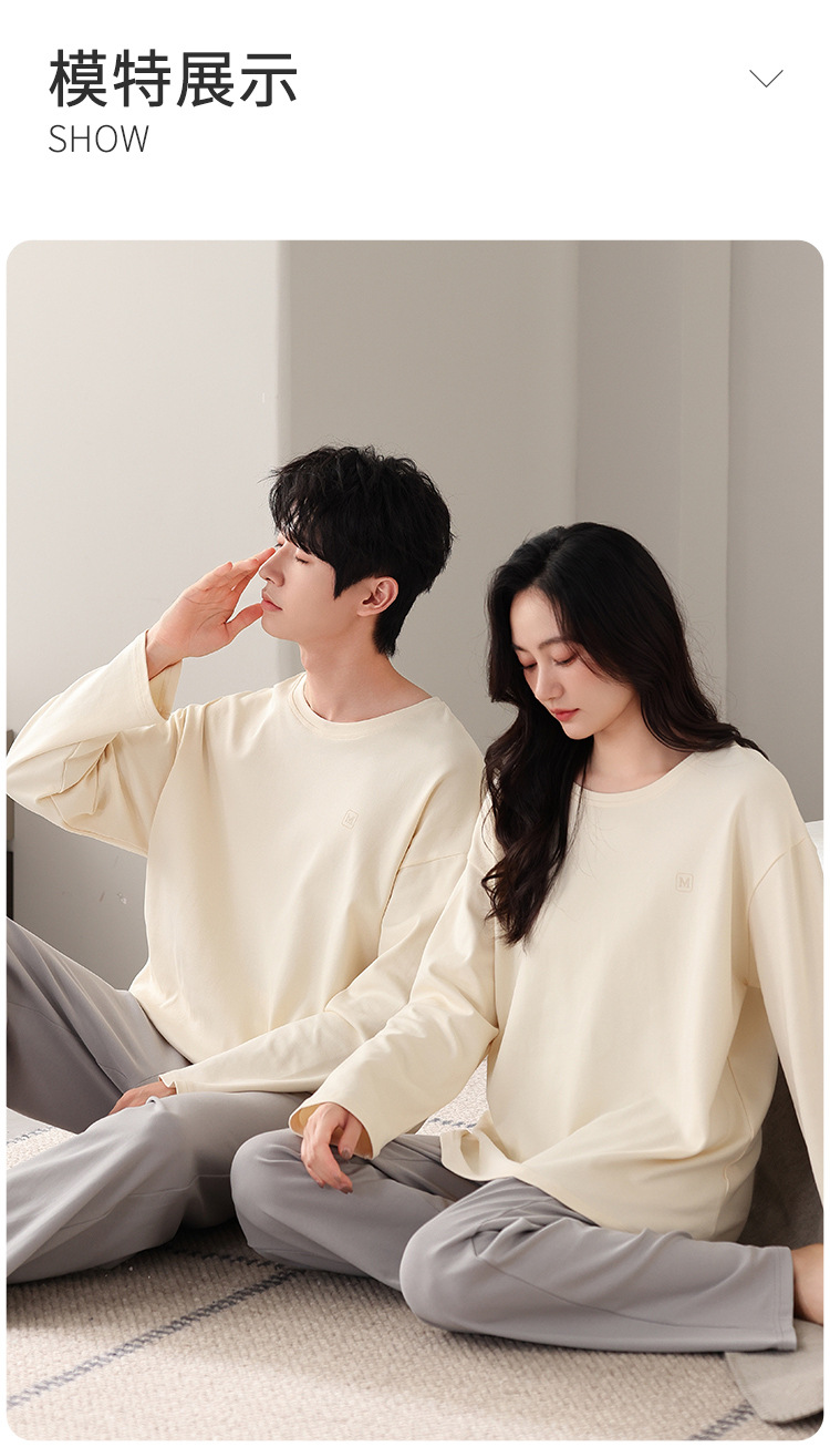 カップル純綿パジャマ男精練綿春夏2025新型長袖プルオーバー丸襟女性ルームウェアセット
