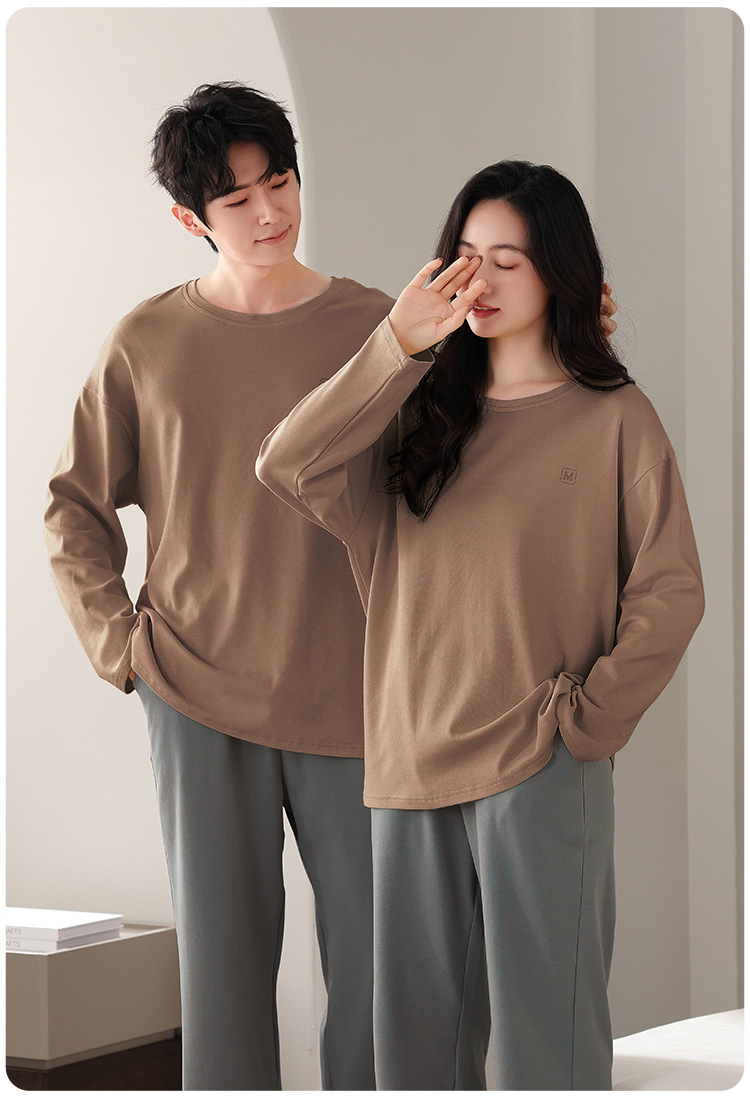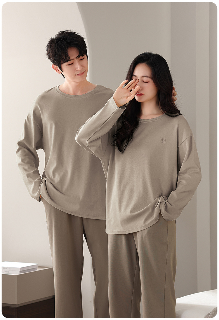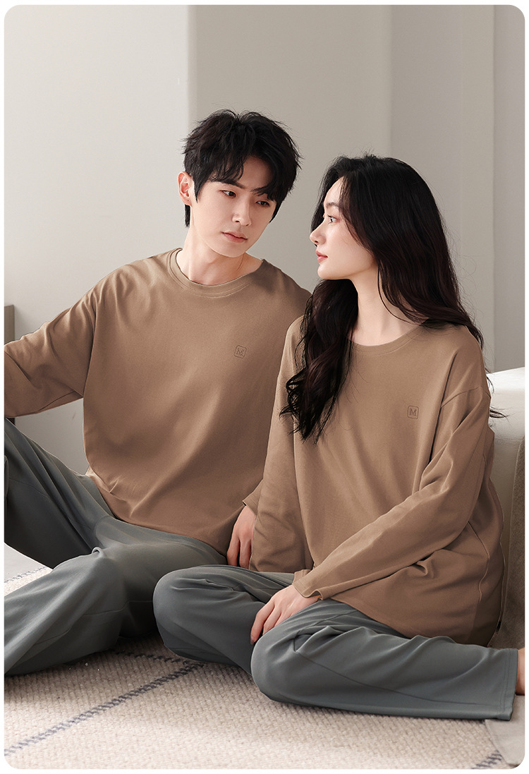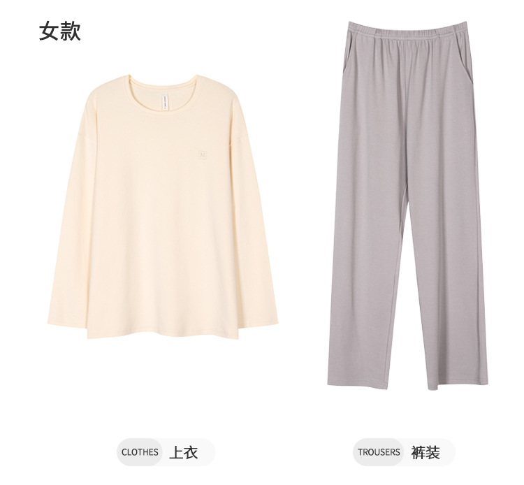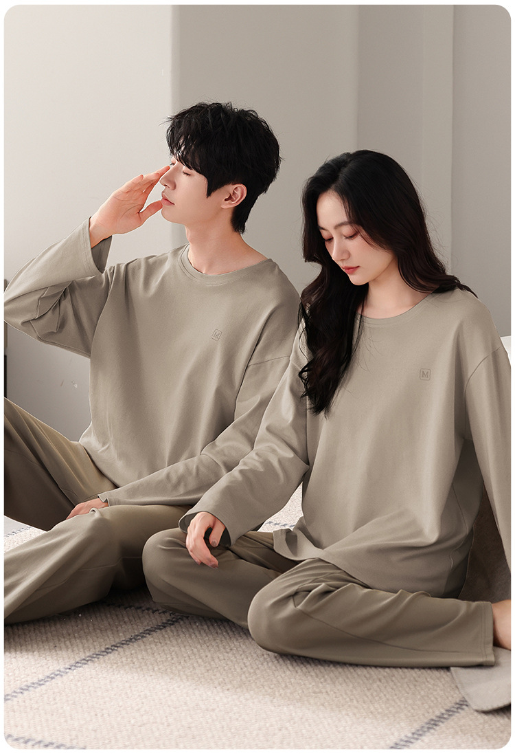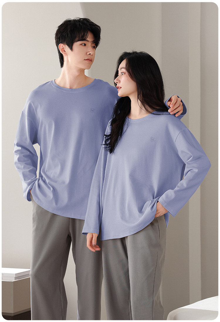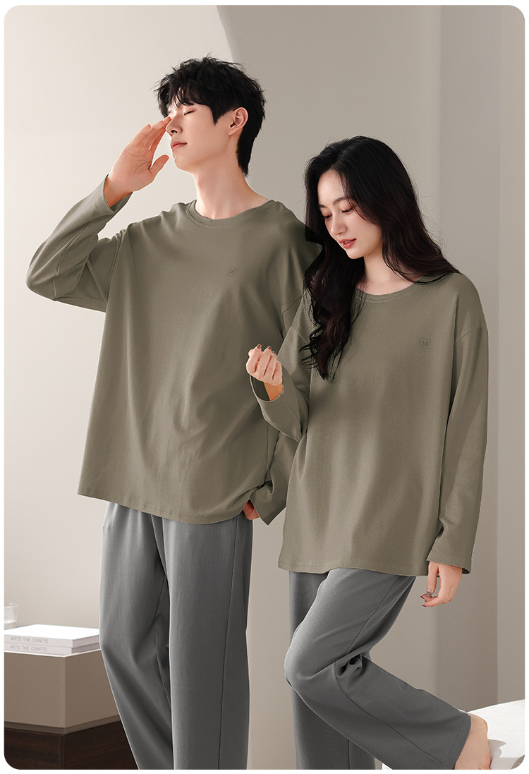 緊密な綿のカップルのパジャマ秋の長袖のズボンはシンプルでカジュアルな純色の男女の同じタイプの家庭服のスーツです。