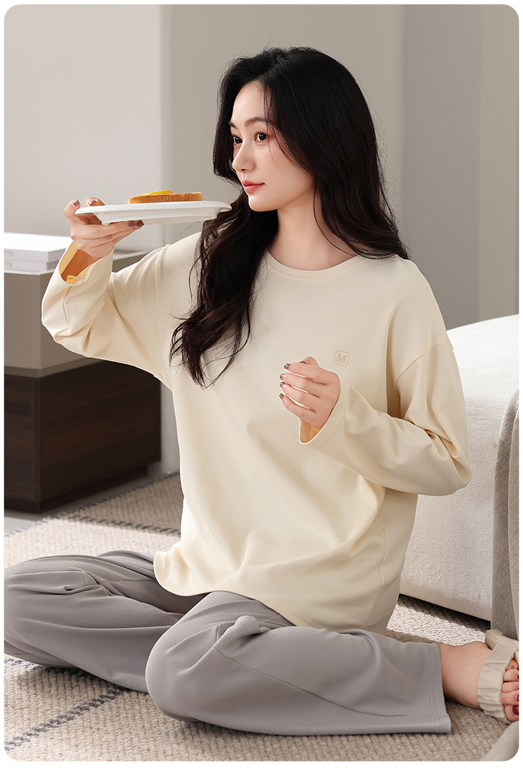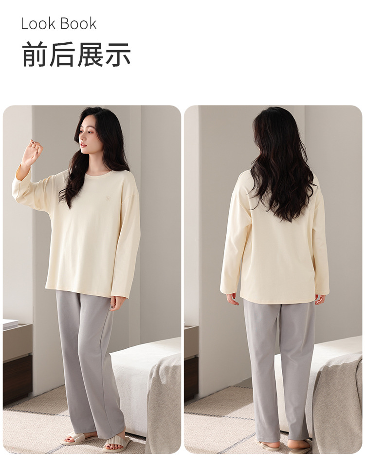 睡衣女新款全棉长袖长裤套头简约纯色春秋季女士家居服宽松休闲