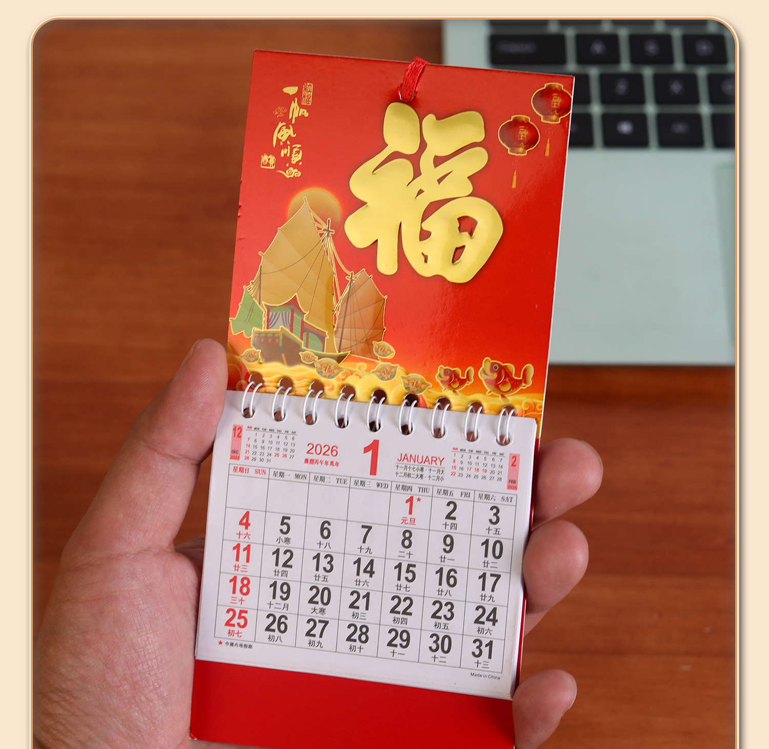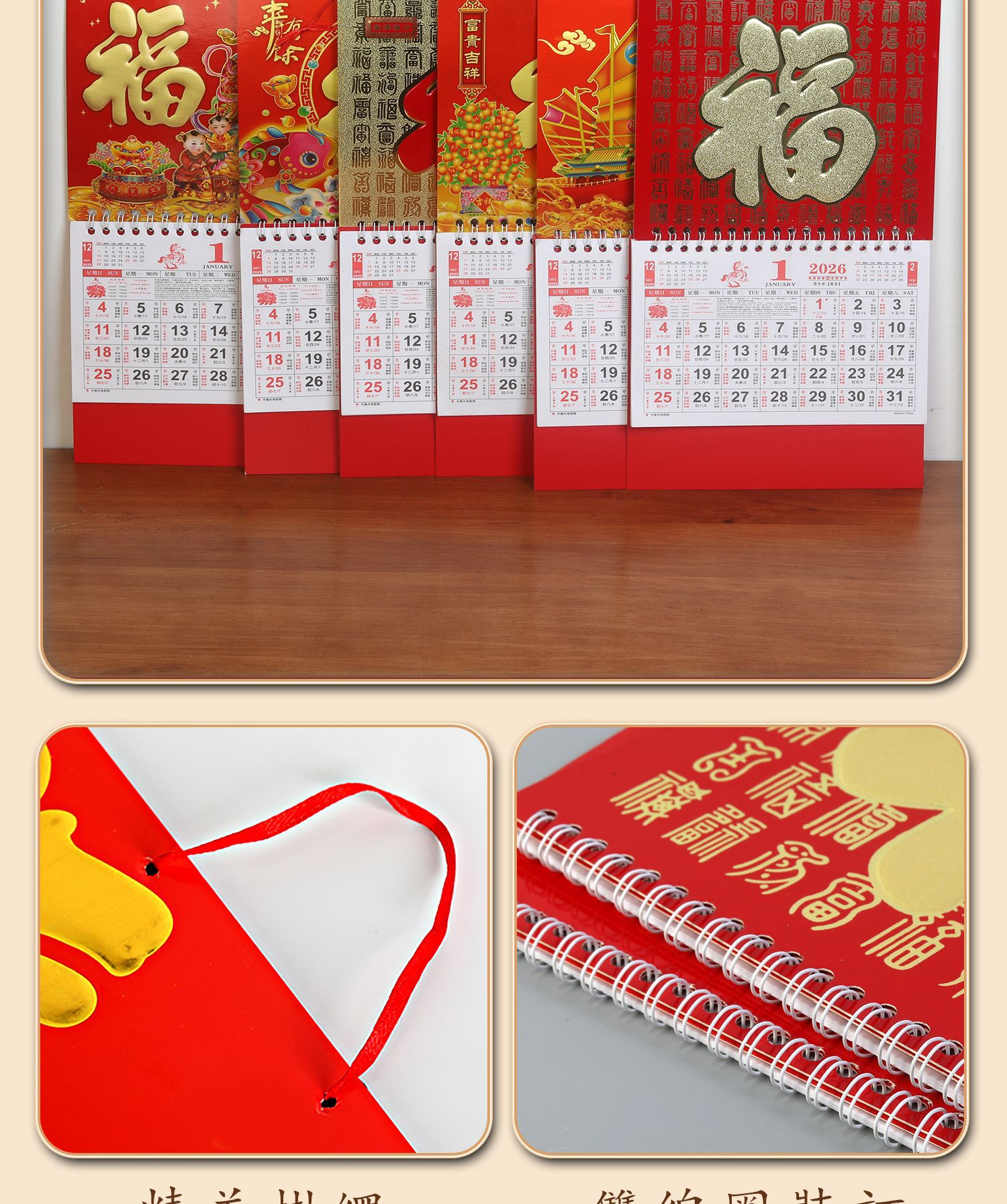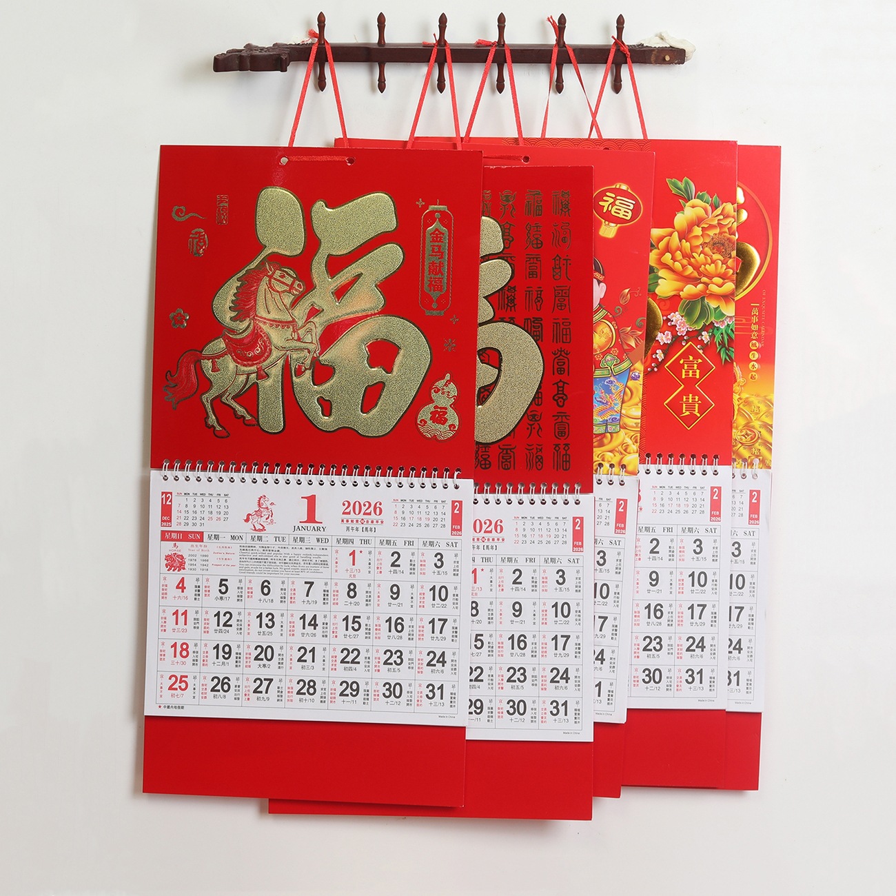 2026年大六開カレンダー、馬年特製、厚手金箔「福」字吊り下げカード、海外貿易用カレンダー、輸出用月間カレンダー