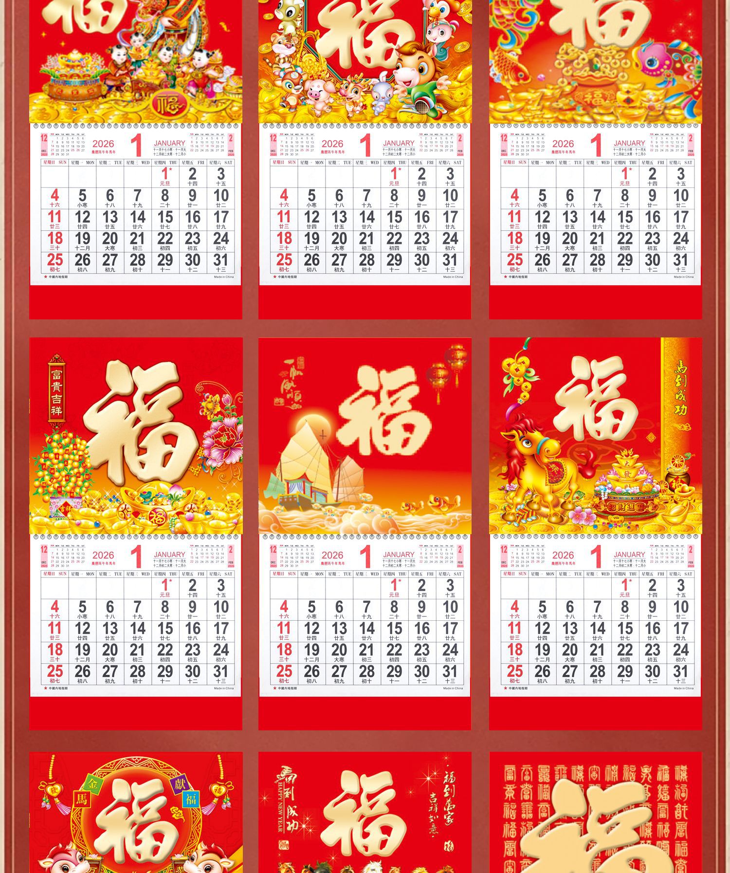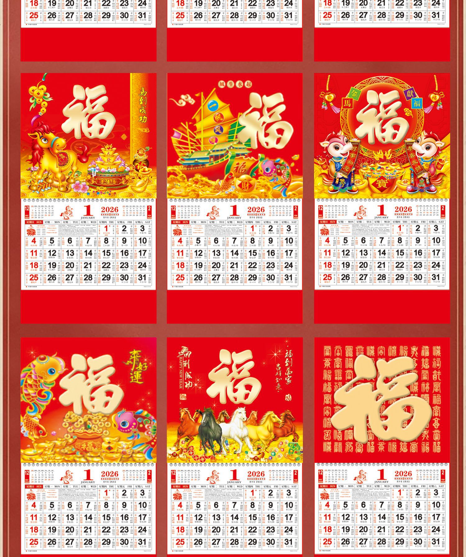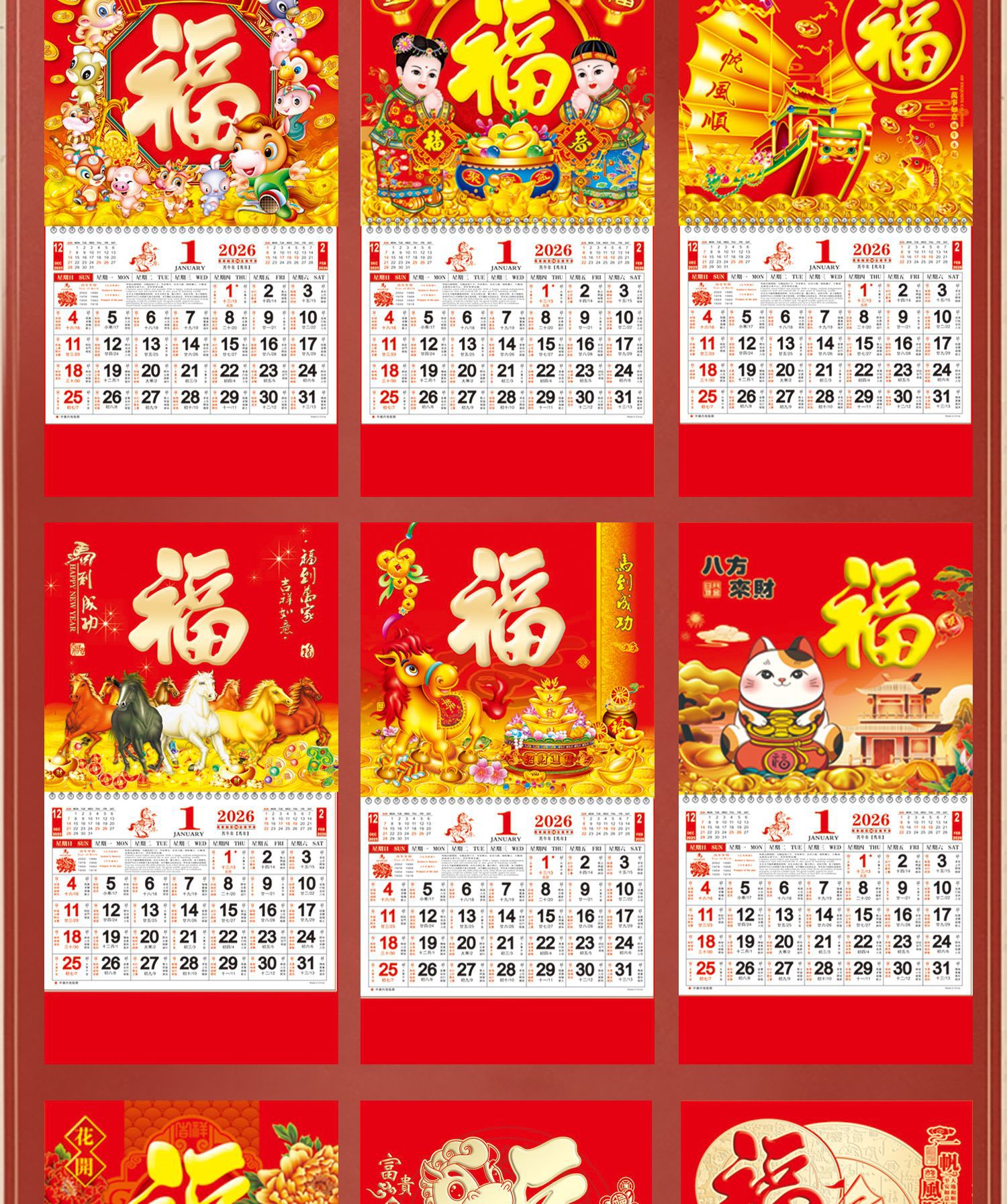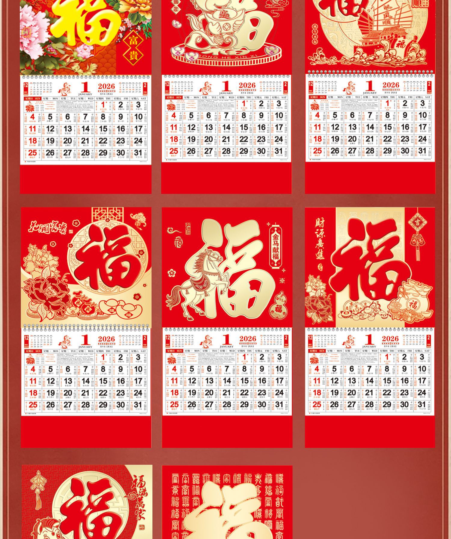 【厂家批发】2026年福字挂历烫金新款马年日历整年跨境吊牌代发