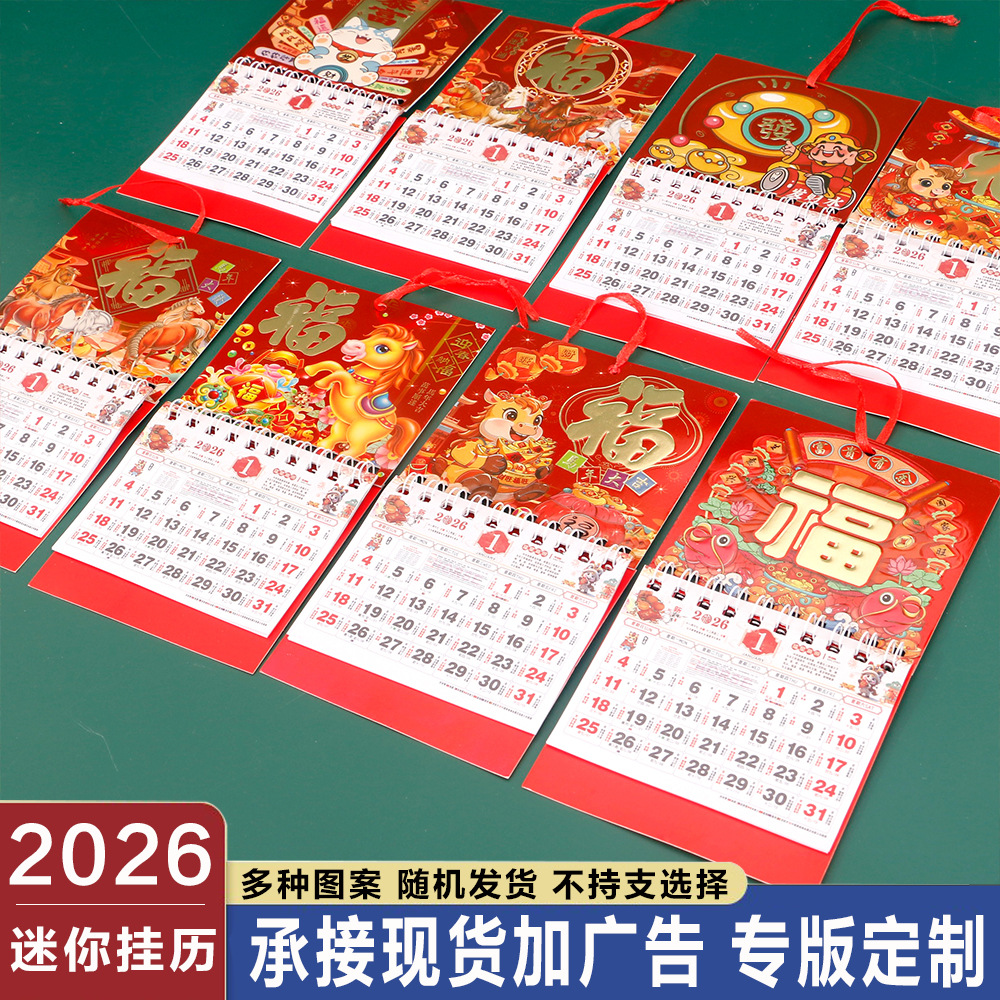 2026年ミニ壁掛けカレンダー通勝老黄历、1ヶ月1枚、広告入り金箔月間カレンダー、小型、新作、昔ながらの黄历