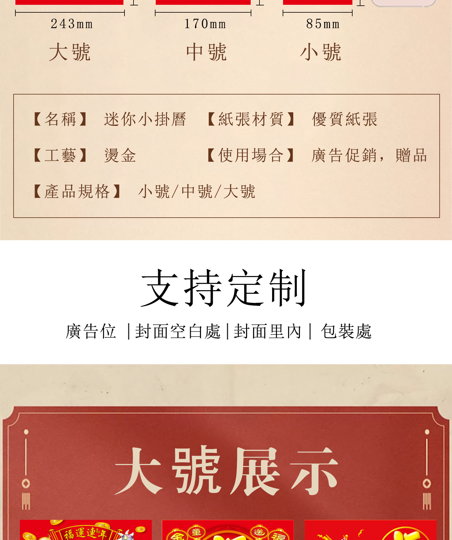 小さな金箔 1 枚 - ランダムカバー - 全体 8.5*17.5cm,中型金箔 1 冊 - ランダムカバー - 全体 17*28.5cm,大同盛 1冊 - ランダムカバー - 全体 24.3*48.5cm,大きな金箔 1 枚 - ランダムカバー - 全体 24.3*48.5cm,この壁掛けカレンダーはサイズが小さいので、注意してください。