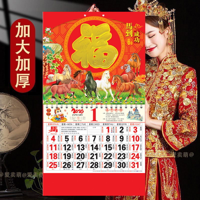 2026年马年挂历墙客厅吊牌挂历月历厂家加印LOGO广告日历六开挂历
