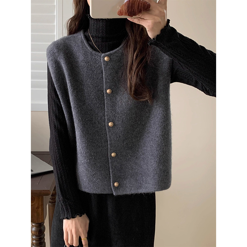 女性のためのハイエンドソリッドカラーラウンドネックニットベスト春の新しい多用途カジュアルシングルブレストノースリーブベストカーディガン