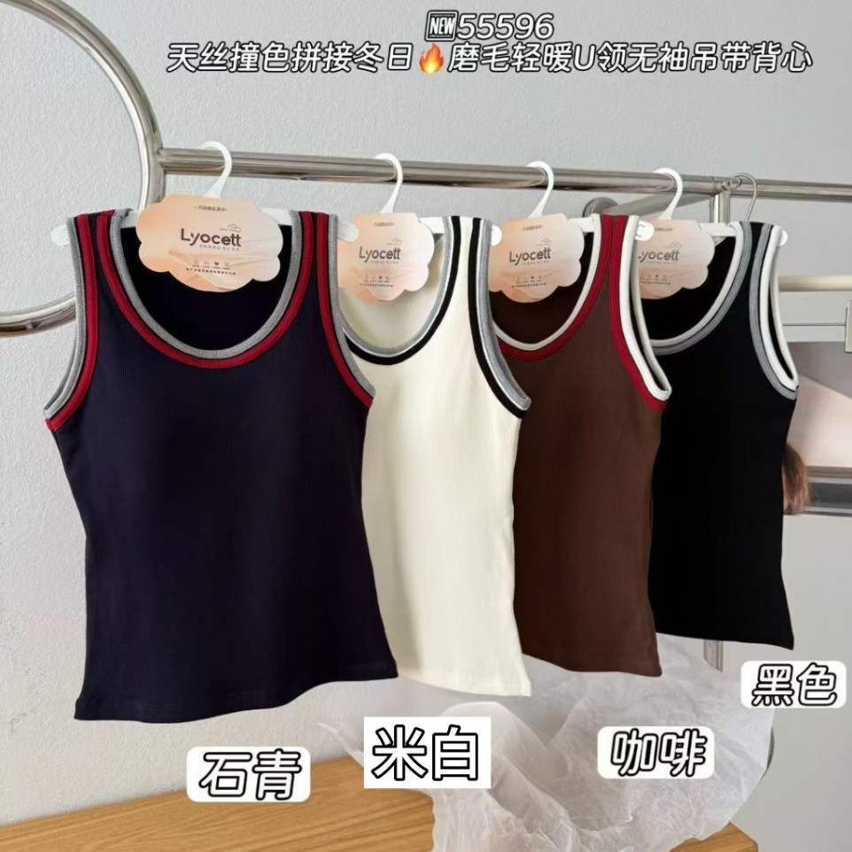 撞色拼接磨毛吊带背心女带胸垫秋冬加绒美背内搭外穿无袖打底上衣