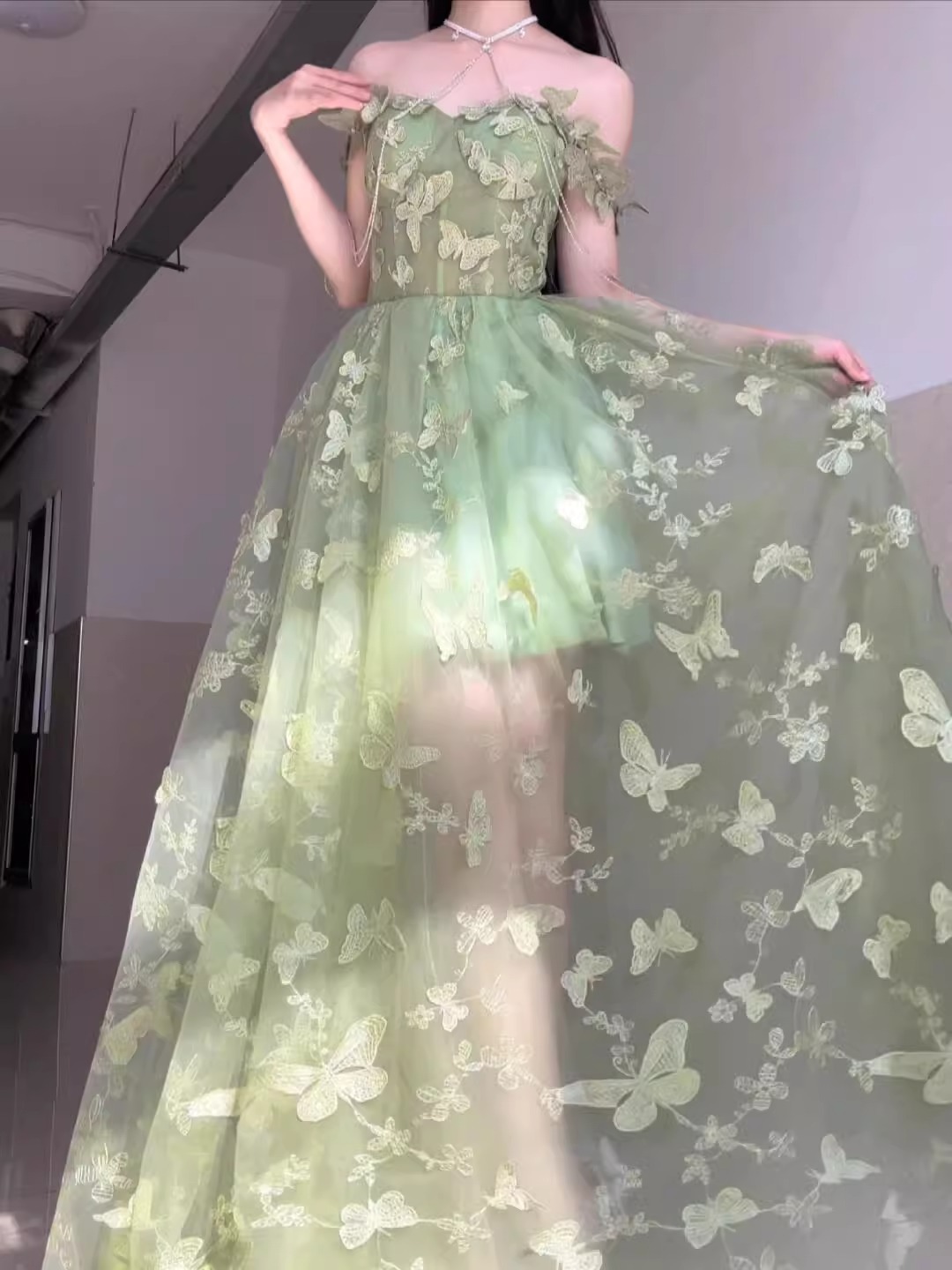 女性用イブニングドレス、ワンショルダー、美しい高級グリーンフォレストスタイル、高校生卒業式、成人式、逃亡プリンセスドレス