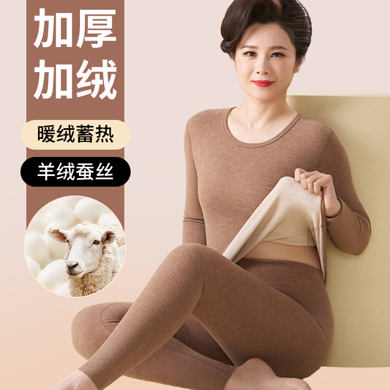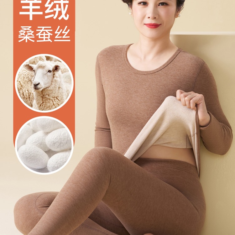 妈妈蚕丝羊绒保暖内衣女线衣棉毛衫加厚秋冬中老年人秋衣秋裤套装