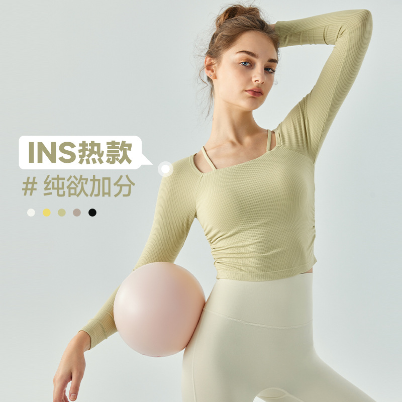 早秋の韓国系の甘い方襟のヨガの上着の長袖の女性の側のしわはやせています。