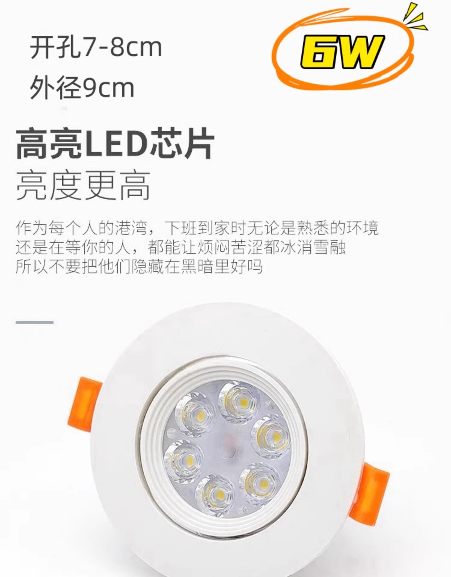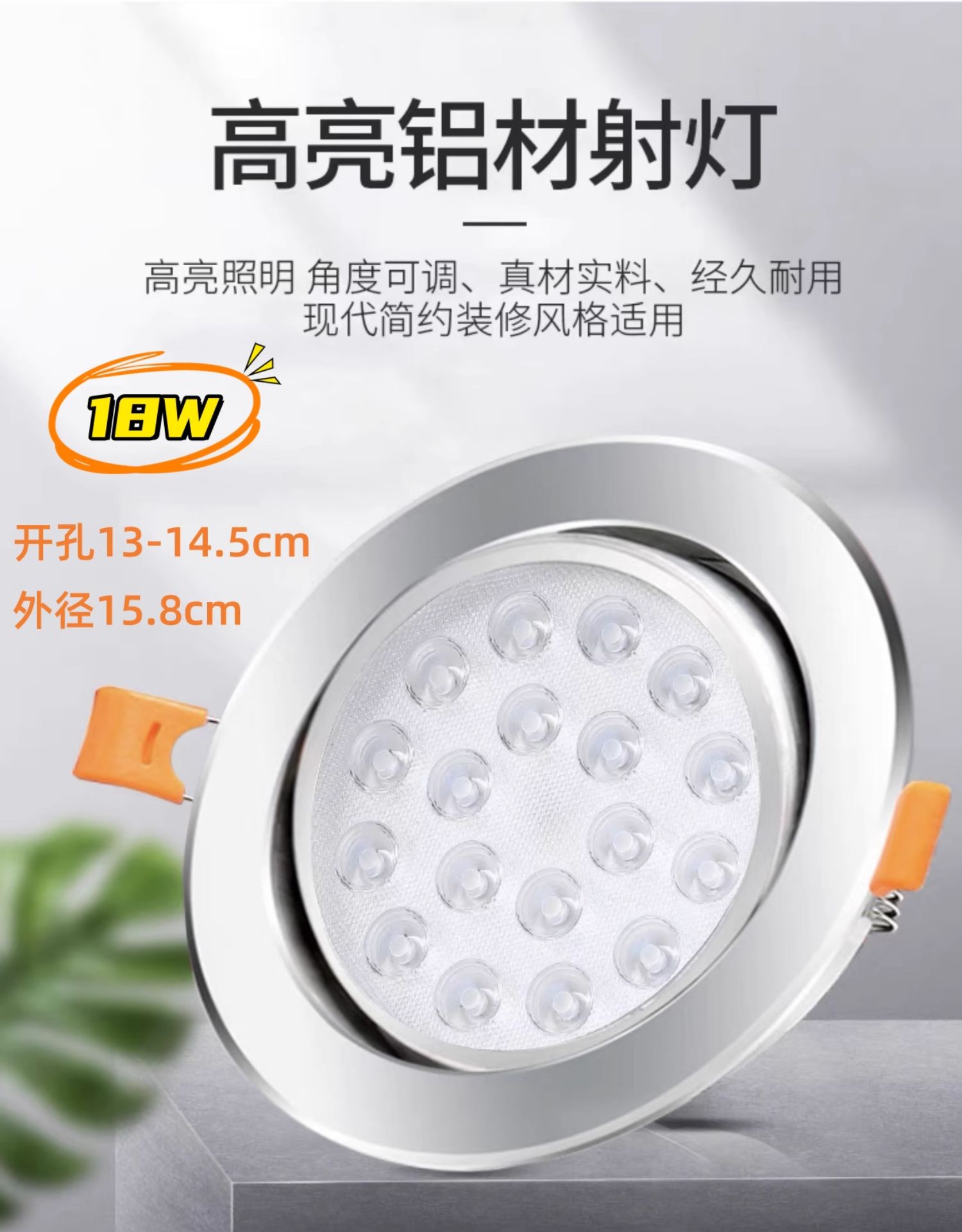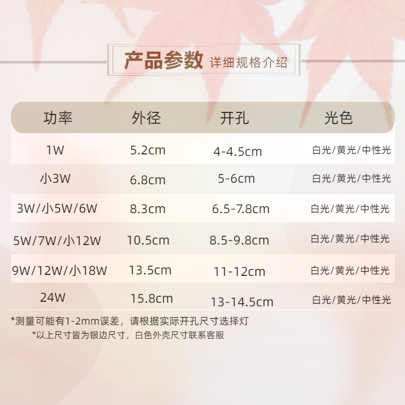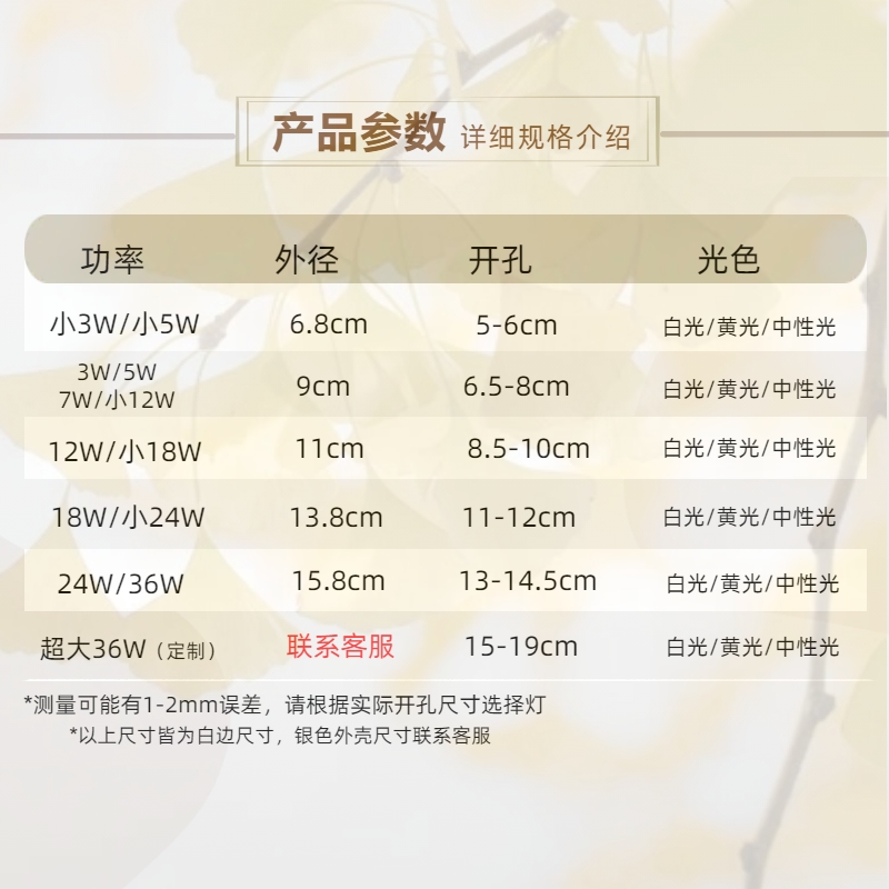 功率 小3W外径64.5开孔55mm,3W升级款外径84.5开孔75mm,5W升级款外径105开孔95mm,7W升级款外径105开孔95mm,9W升级款外径138开孔120mm,12W升级款外径138开孔120mm,15W升级款外径158开孔140mm,18W升级款外径158开孔140mm
