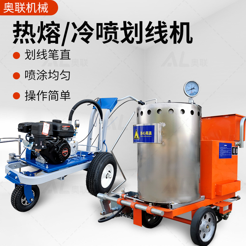 手推冷喷划线机是道路常温标线专用设备。适用于公路、市区、广场、停车场、机场等各种直线、虚线、诱导线、斑马线、文字、图形等。