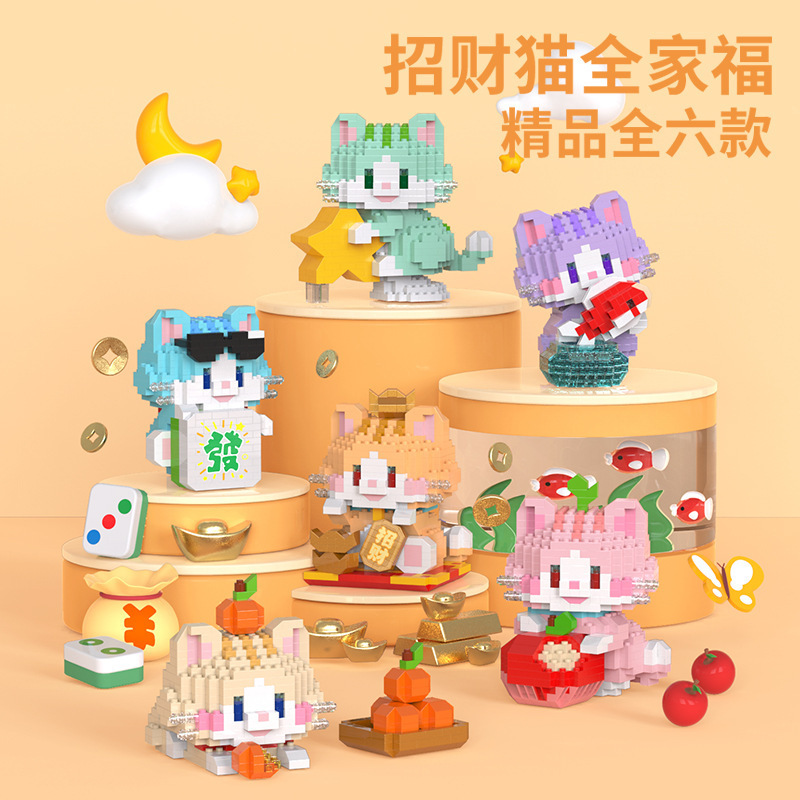 楽楽兄弟国潮招き猫日記微粒子積み木男男女の子益智相乗り玩具積み木置物