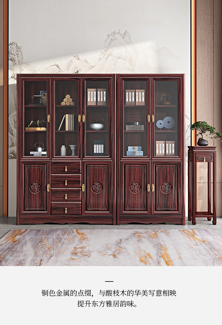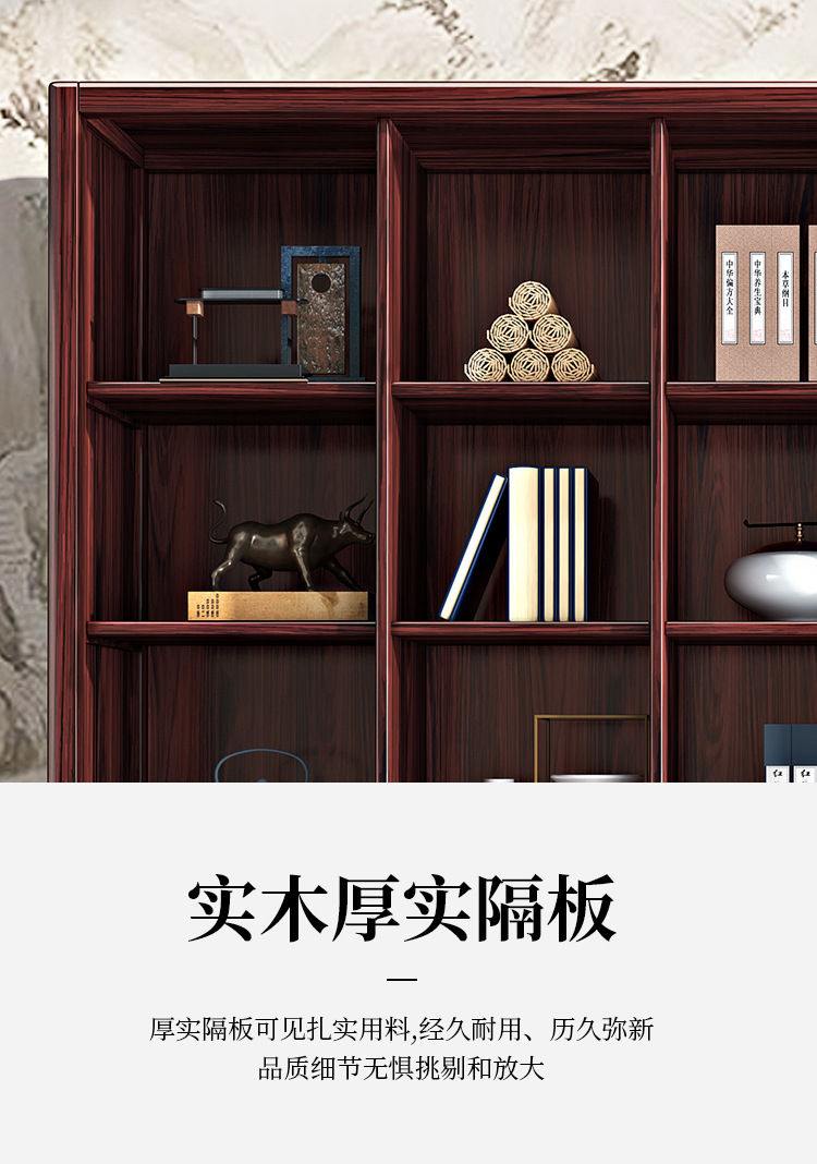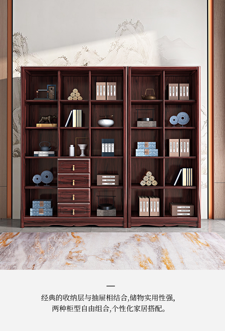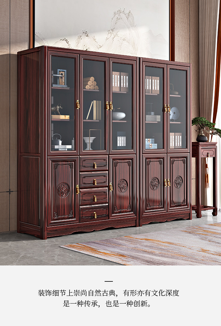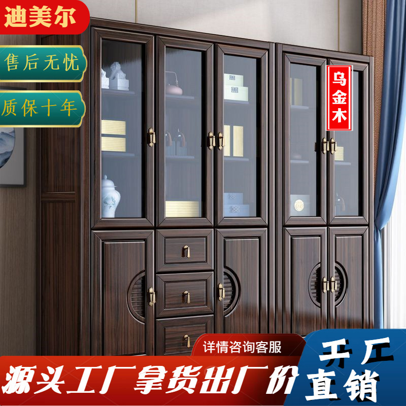 乌金木新中式实木书柜带玻璃门书架一体组合展示柜家用落地储物柜