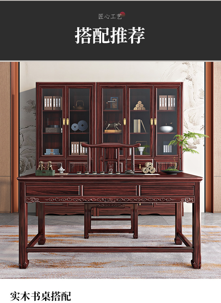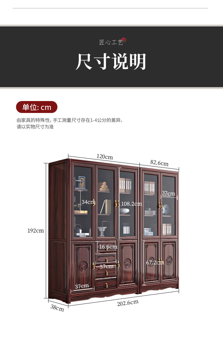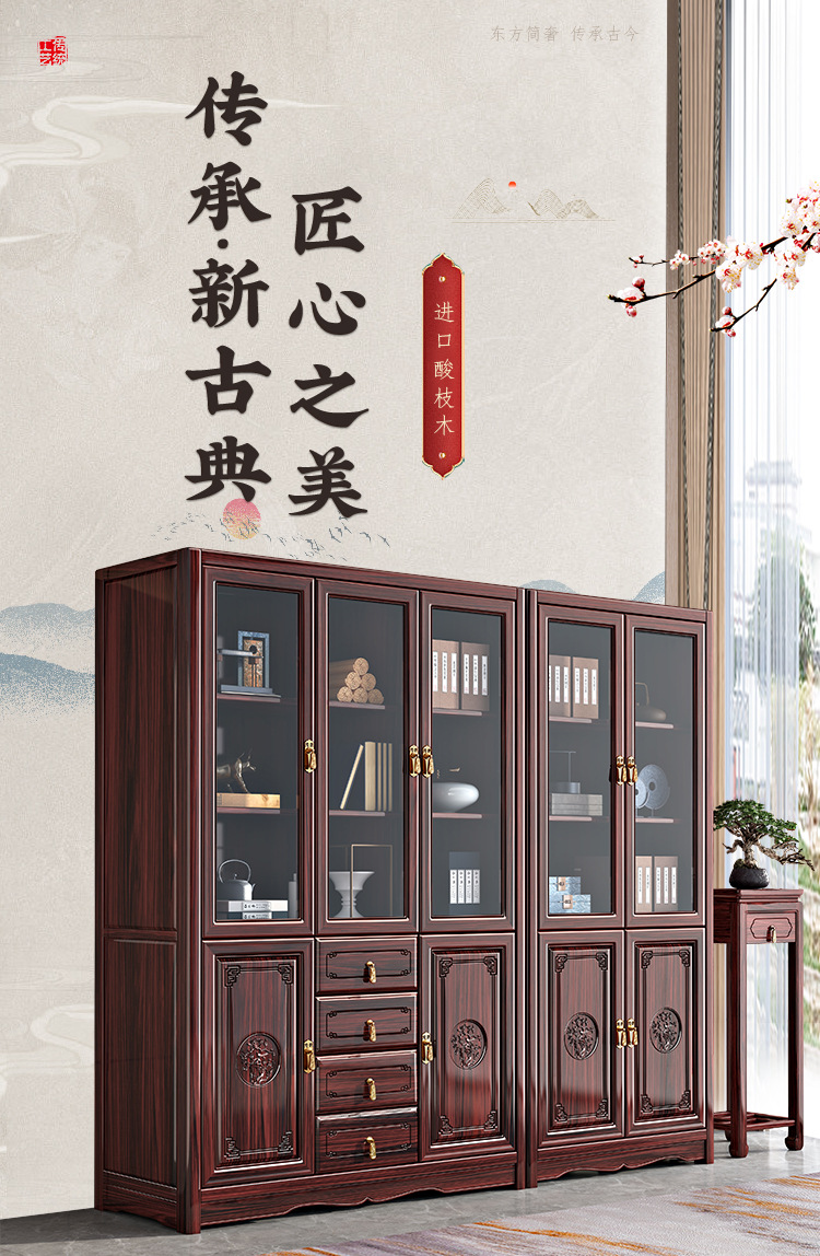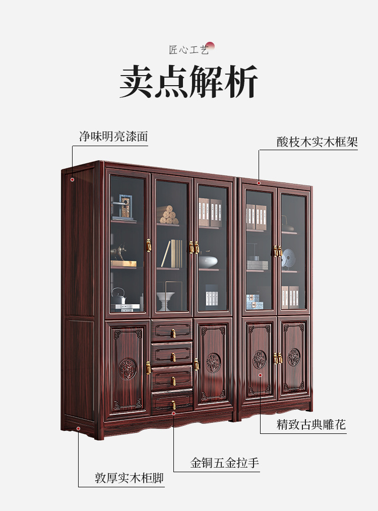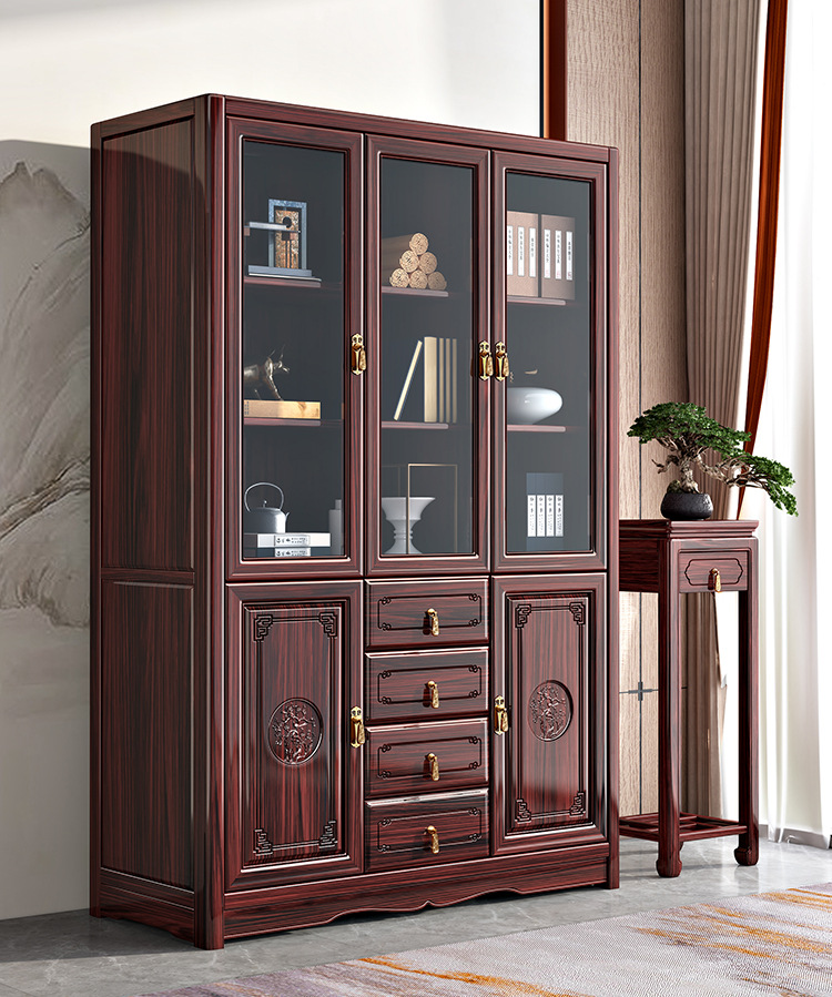 乌金木新中式实木书柜带玻璃门书架一体组合展示柜家用落地储物柜