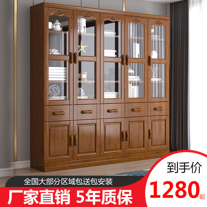 中国式実木本棚全実木家庭本棚ガラス扉付き現代シンプルオフィスキャビネット収納一体キャビネット