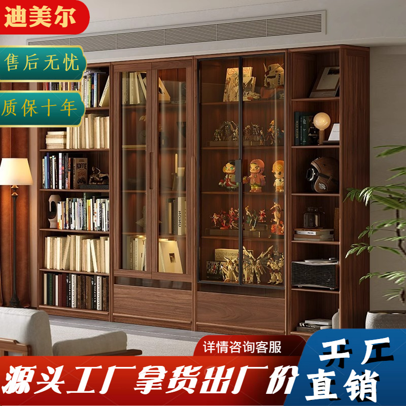 黒胡桃木実木本棚新中国式本棚一体壁ガラス扉キャビネットオフィス書斎収納展示棚