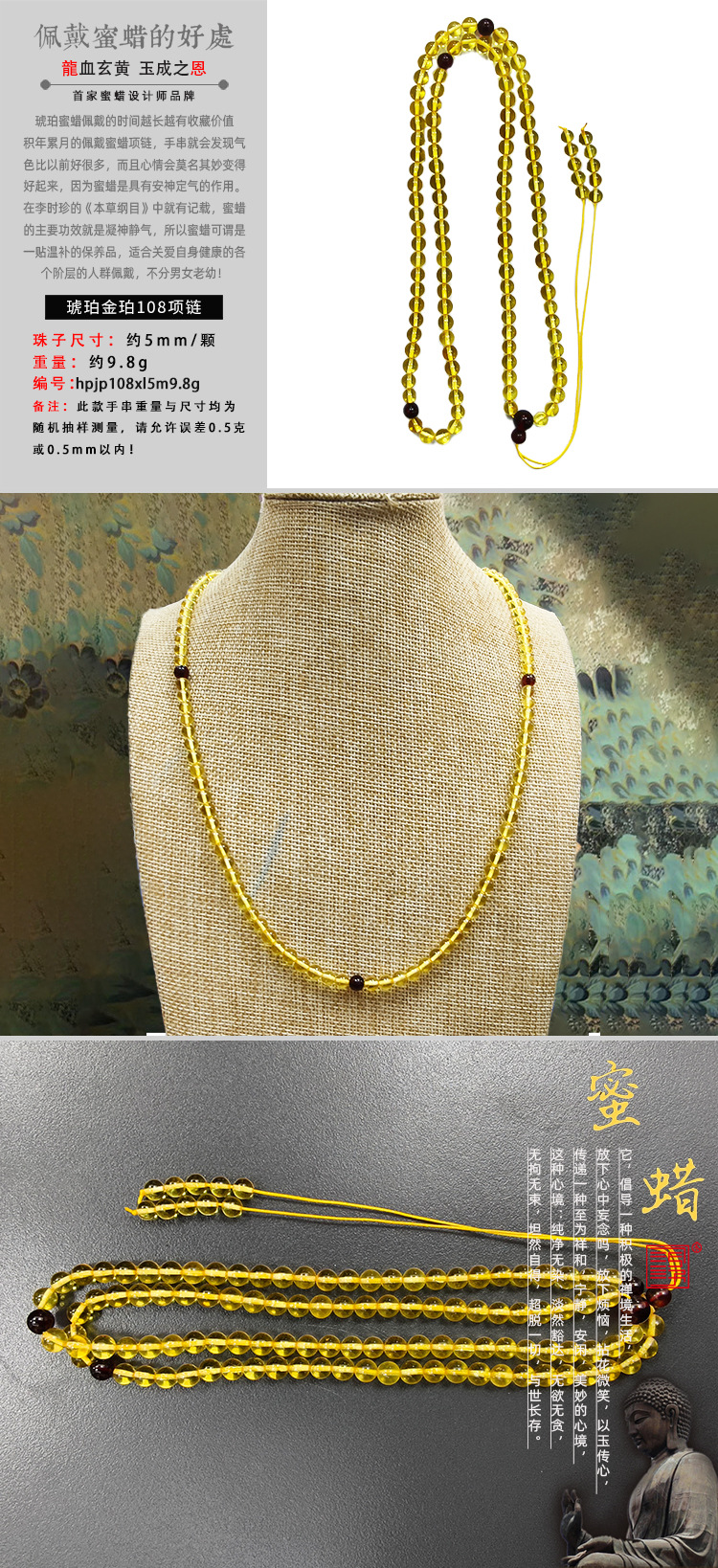 バルト海天然琥珀ハニーゴールド琥珀 108 ネックレス手織りエスニックスタイル忠実度多用途トラベルジュエリー