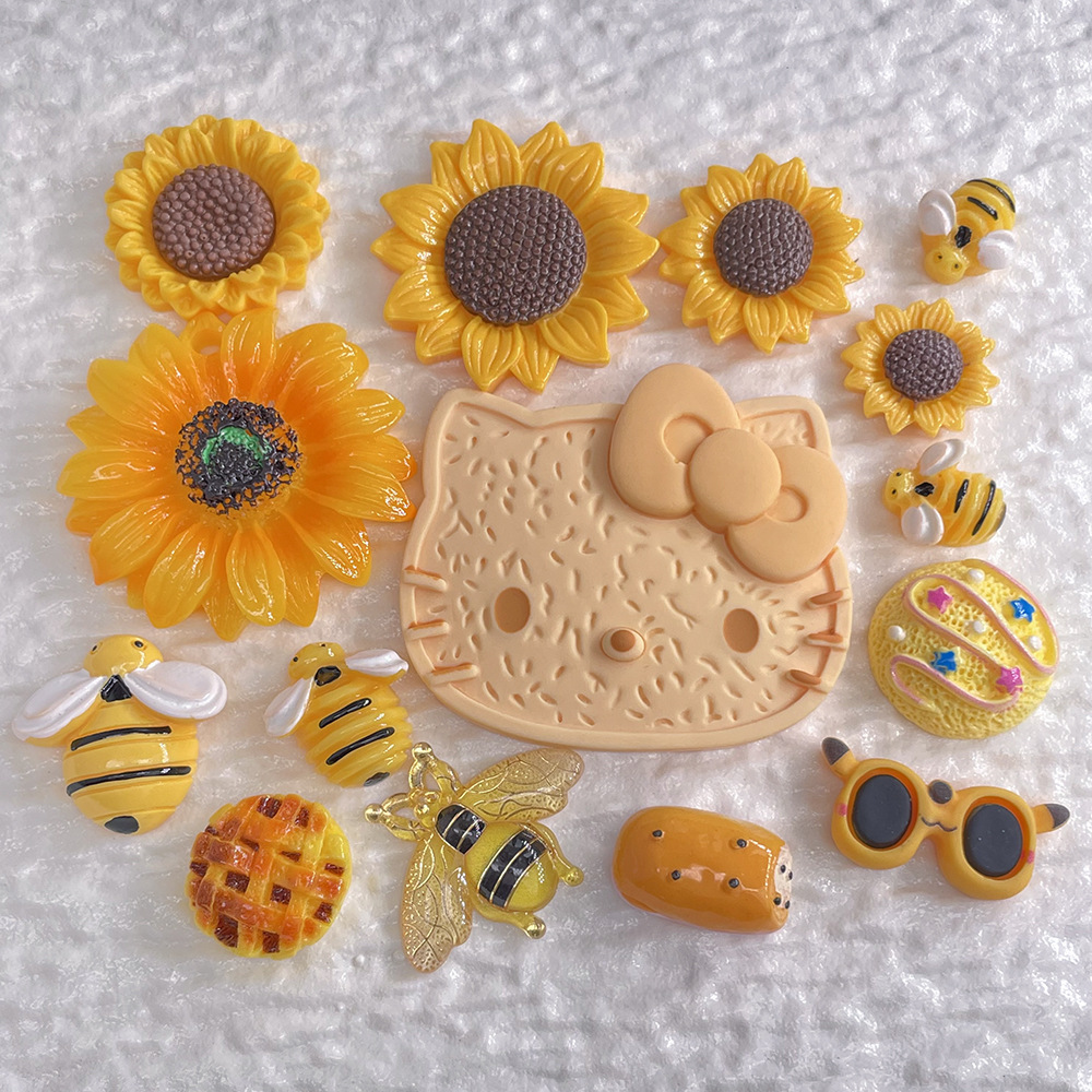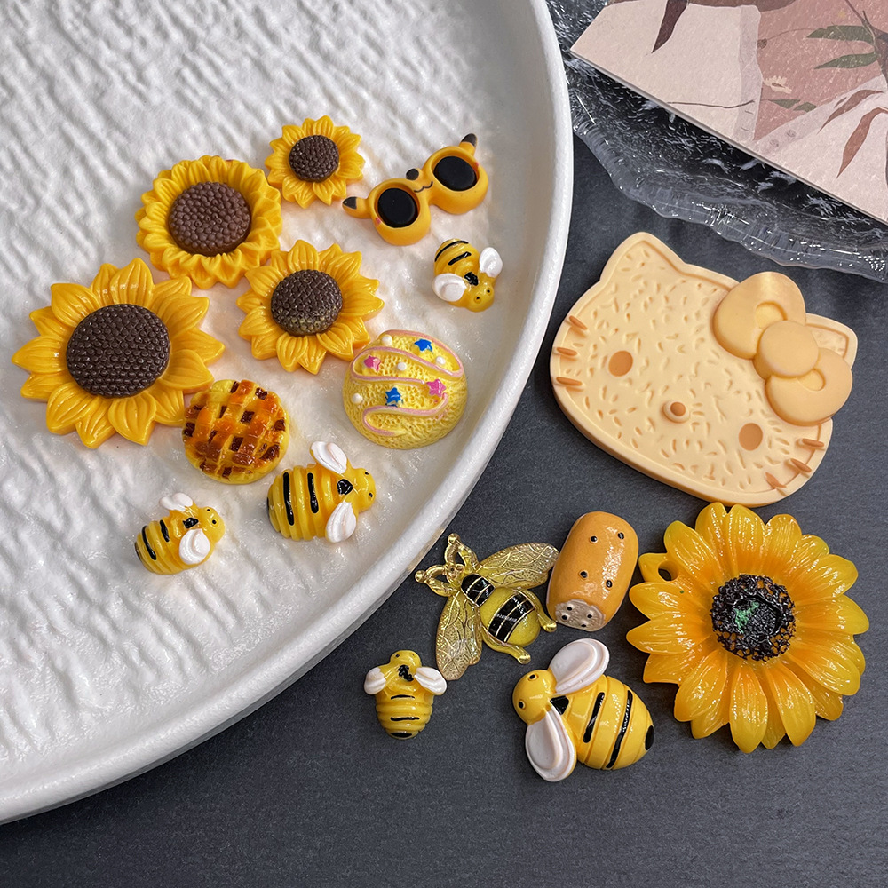 大きなKTイエロークッキー,45*45mm インクジェットプリントひまわり,40*40mm ドットオイルひまわり,28*28mm ドットオイルひまわり,30*30mm つや消しペイントひまわり,大きなペイントされた蜂,ミディアムペイントされた蜂,小さな塗装された蜂,高級透明ミツバチ,黄色のアイスクリームボール,黄色のサングラス,ノッチパン,メッシュパン