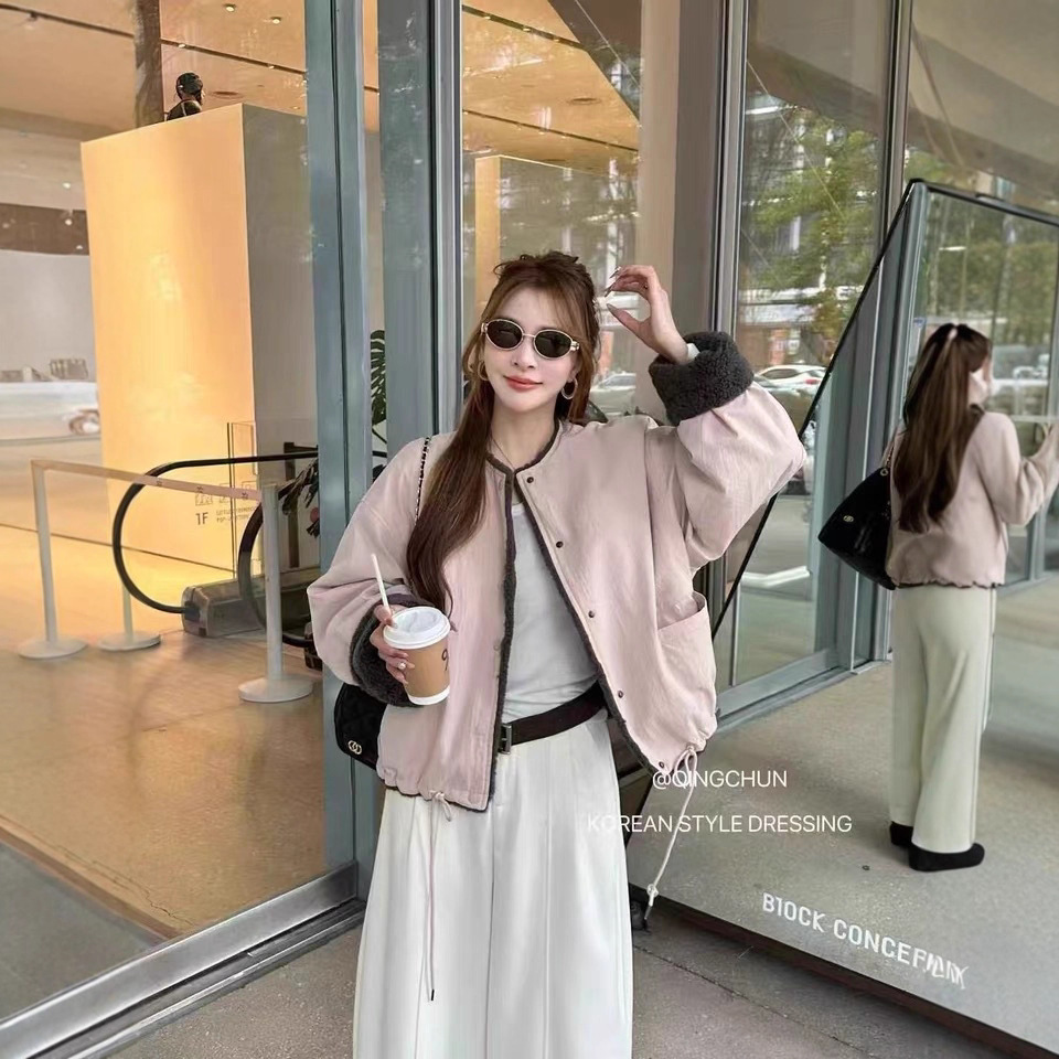 设计感拼接羊羔毛圆领派克服短款外套女欧货2025秋季新款夹克上衣