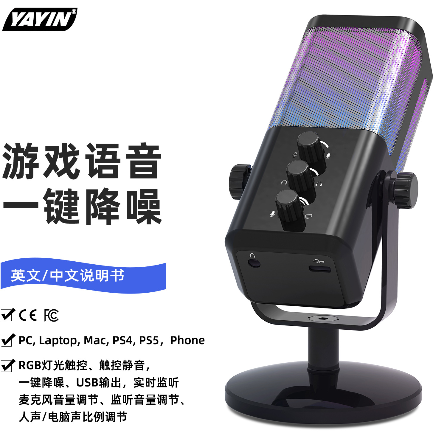 按键功能 1.触摸按键:短按静音 2.调节灯光模式 可调节麦克风音量增益