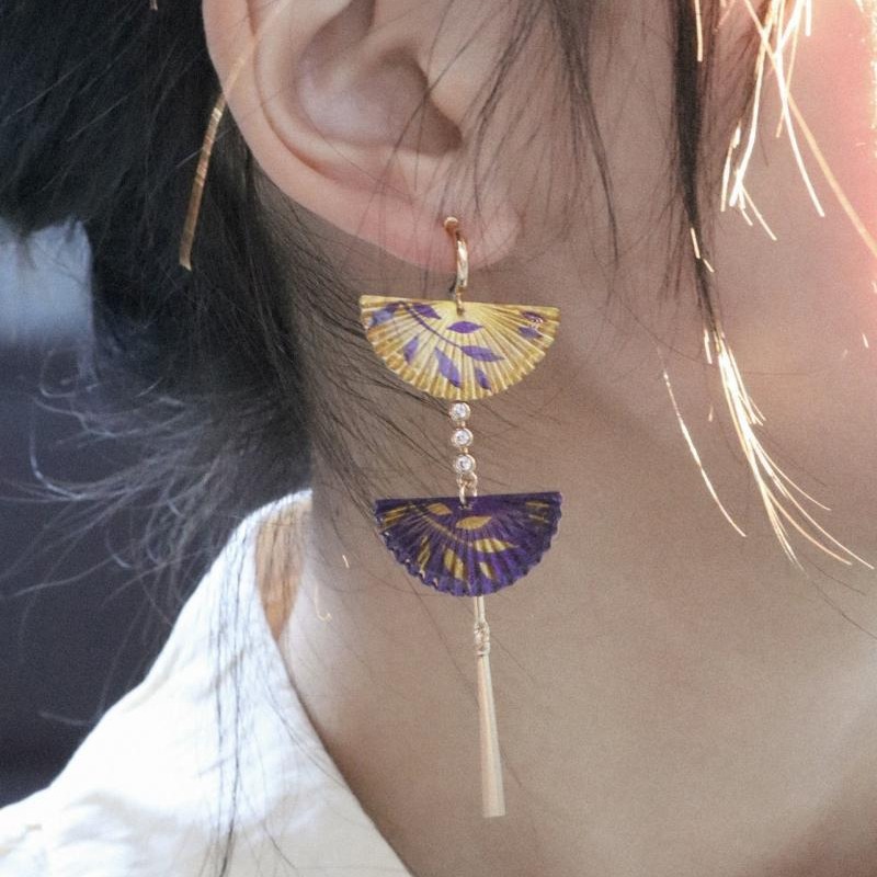 山印集手描き【畳扇・復】紫金伝統色新中国式フリンジ扇形イヤリングピアス