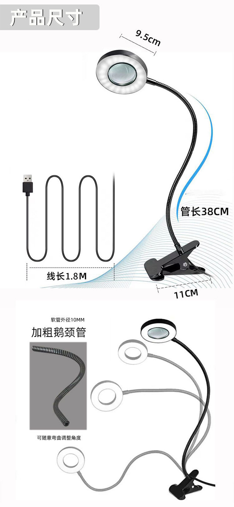 95mm拡大鏡クリップライト、フレキシブルホース付き拡大鏡、ライト付きモデル、タトゥーライト、美容メイク補助光、眉毛タトゥー、リップタトゥー