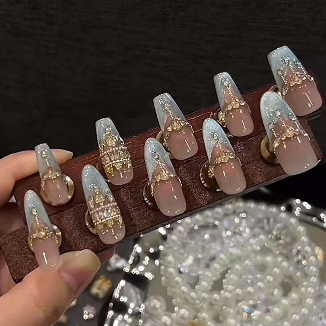 【青い城】新型の純粋な手作業は甲の爆発物の猫の目の純粋な手を身につけて式の高級感の美甲を着ます。