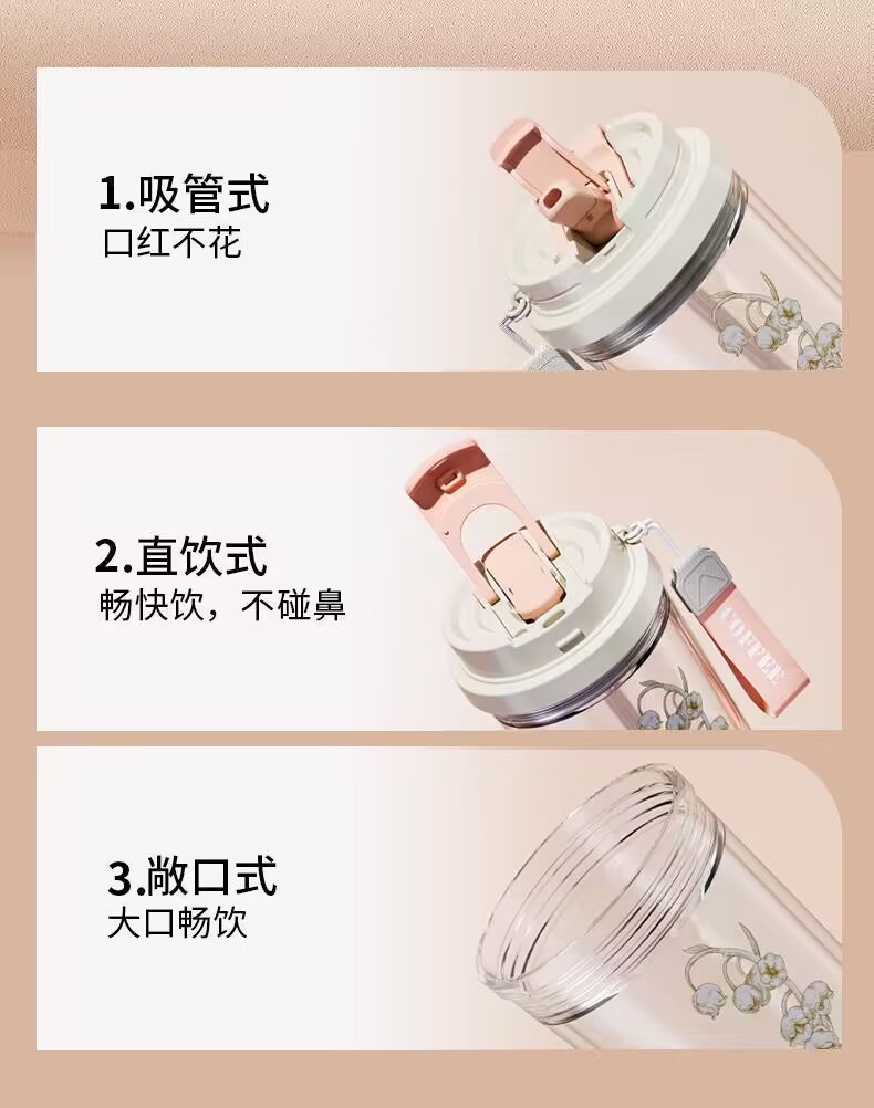 女性用夏用ダブルドリンクプラスチックカップ、ストロー付き、高温耐性コーヒーウォーターカップ