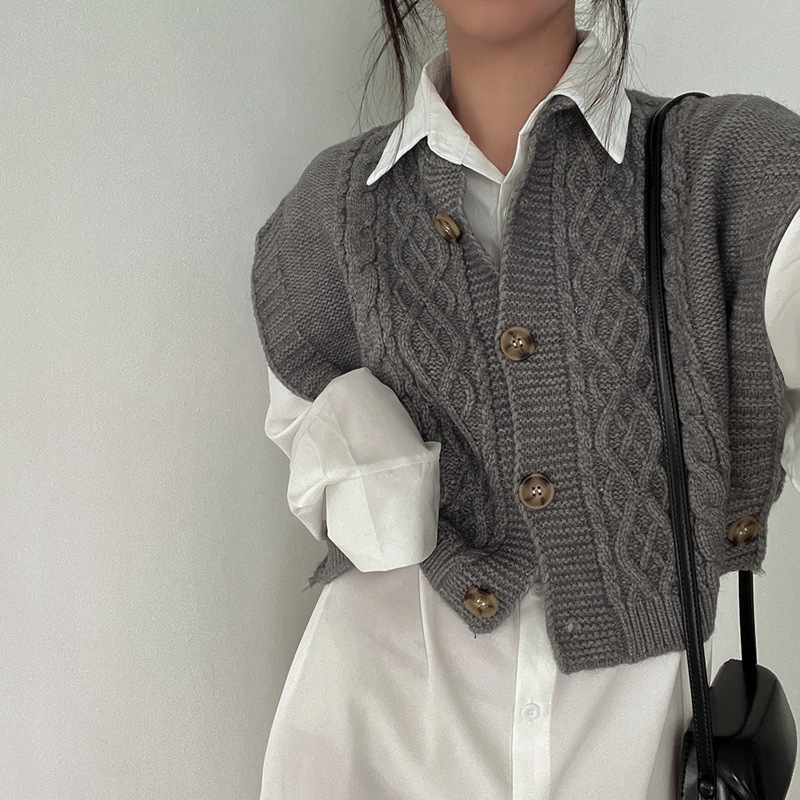 ノースリーブのベストの女性は麻のボタンの文芸風の灰色の丸首のニットのベストの女性のタイプを着て重ねて着ます。