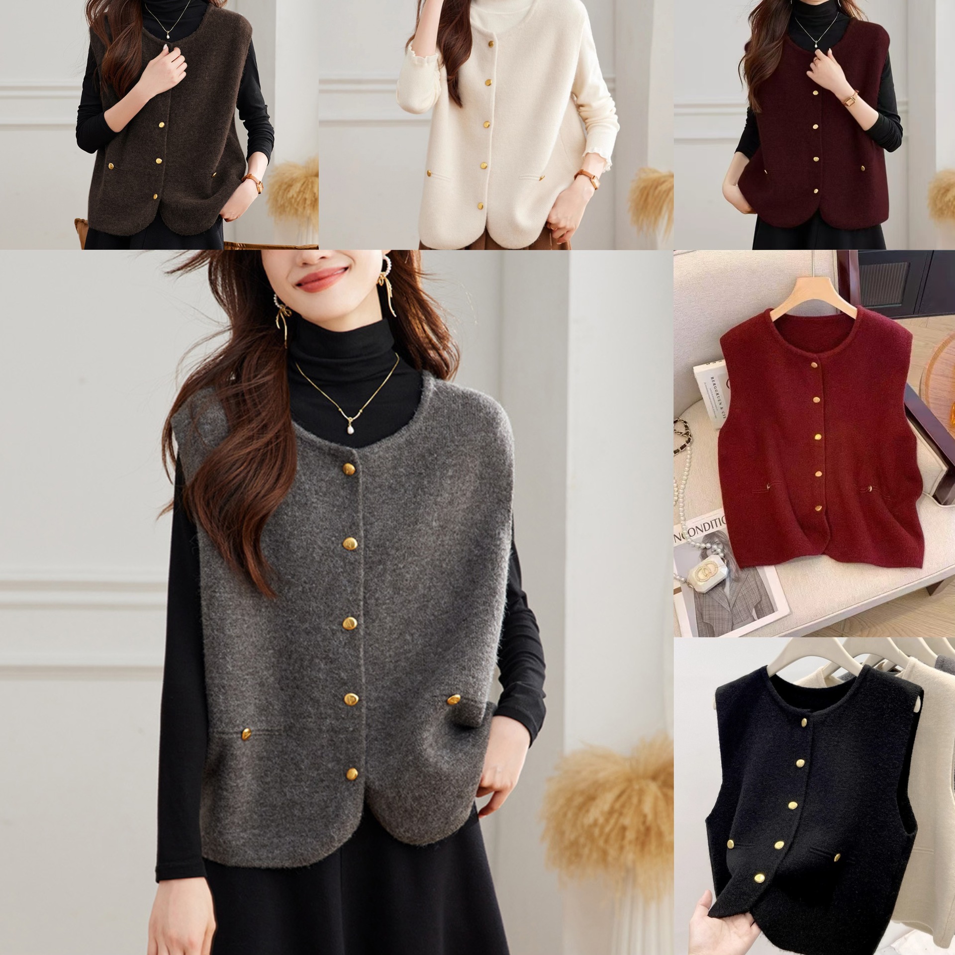 フェイクポケットラウンドネックノースリーブニットジャケット女性のための春と秋のチョッキベストトップ韓国スタイルのファッションカジュアルセーターベスト