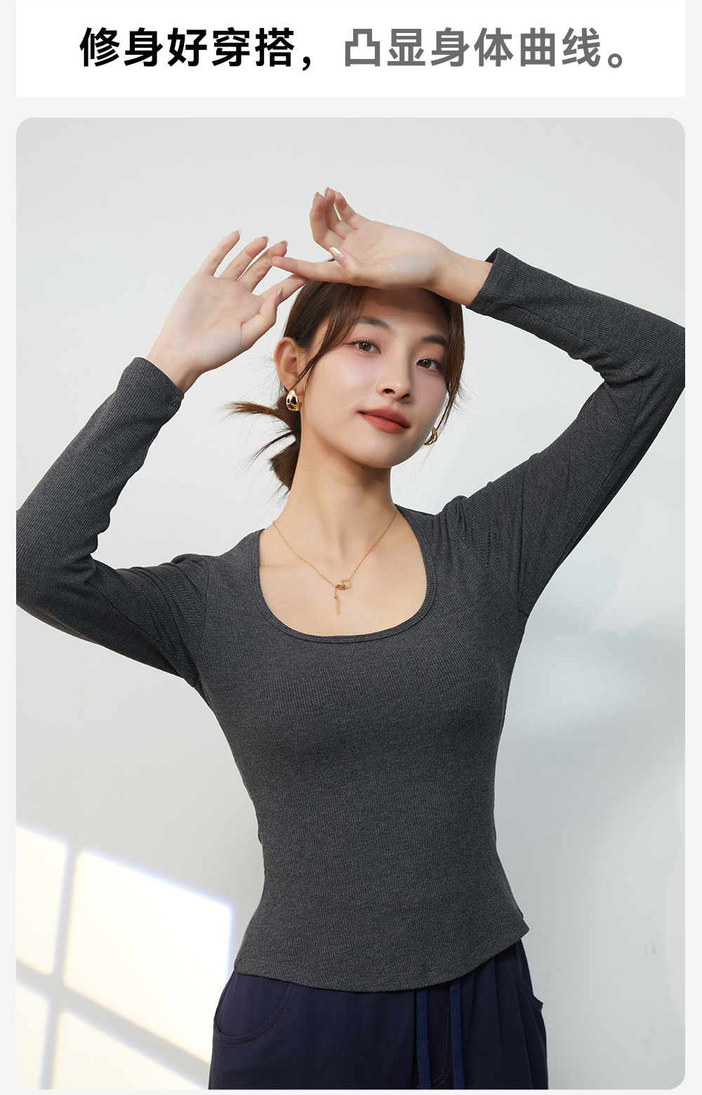 罗纹纸片人亨利衫超弹瑜伽健身长袖