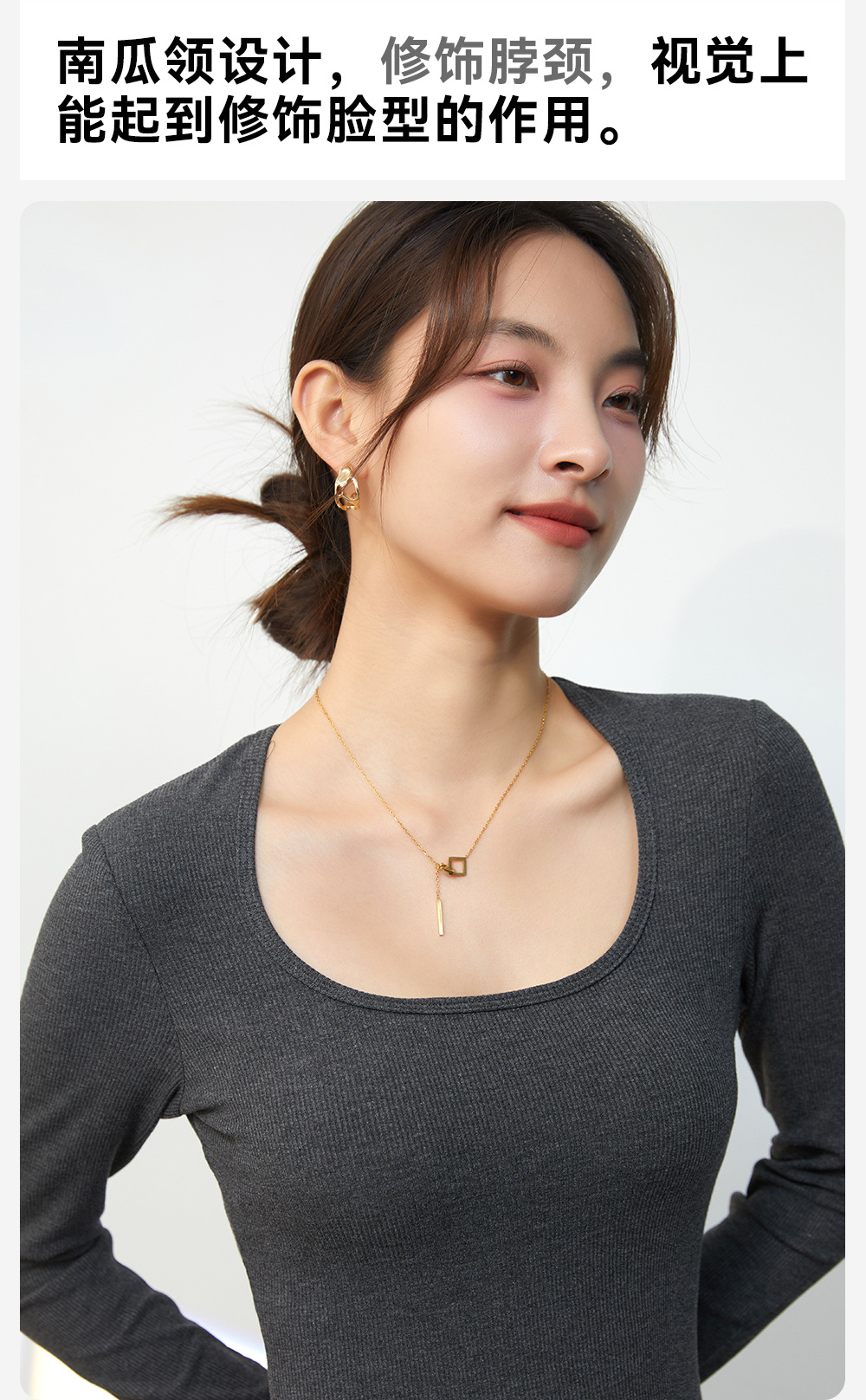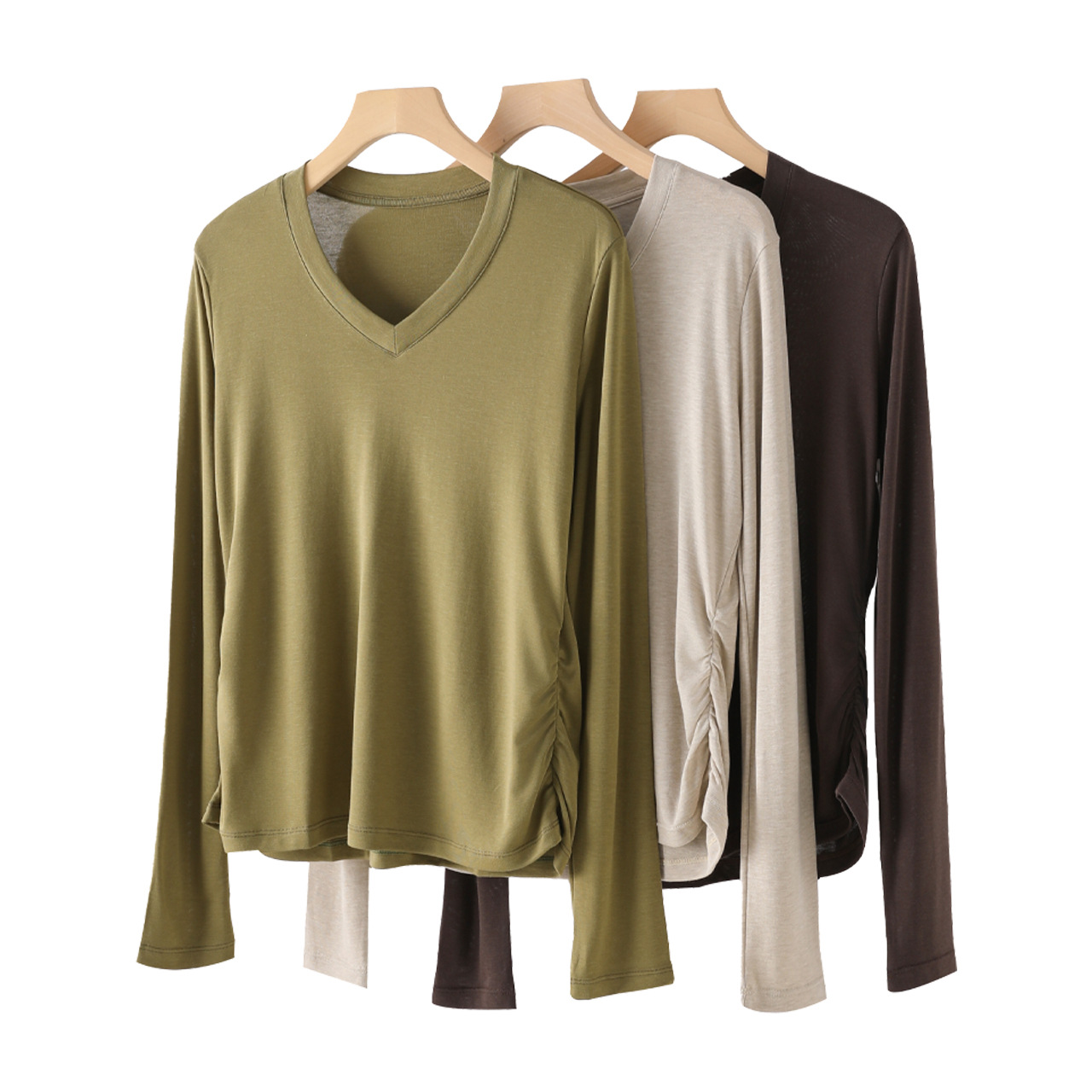 秋冬新女士侧抽褶独特V领设计感T恤打底衫宽松减领长袖纯色上衣潮