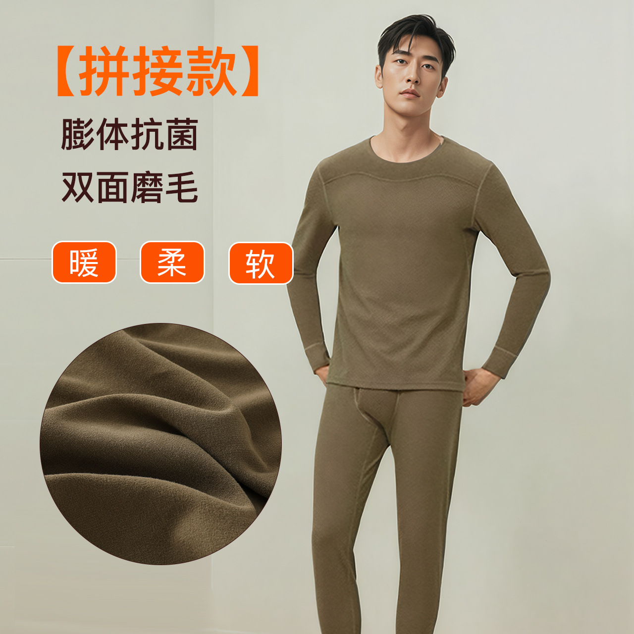双面磨毛拼接式肌底保暖内衣套男秋圆领秋衣裤薄款抗冷透气N05T01