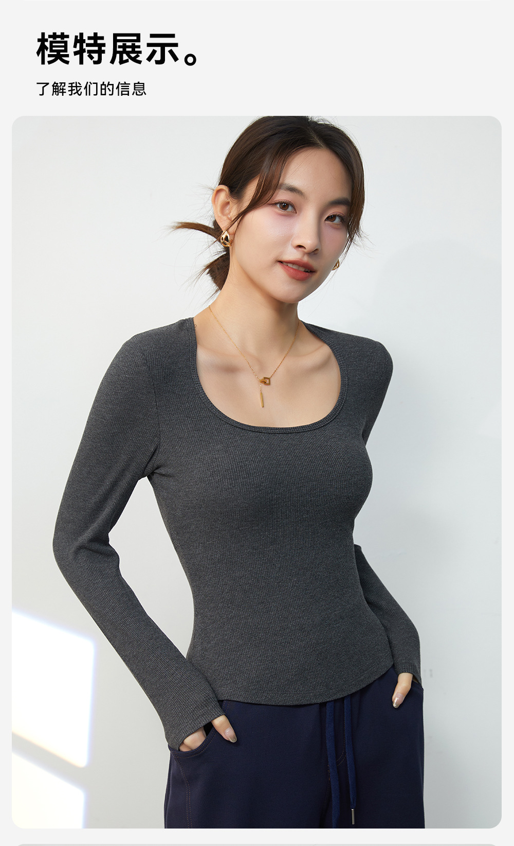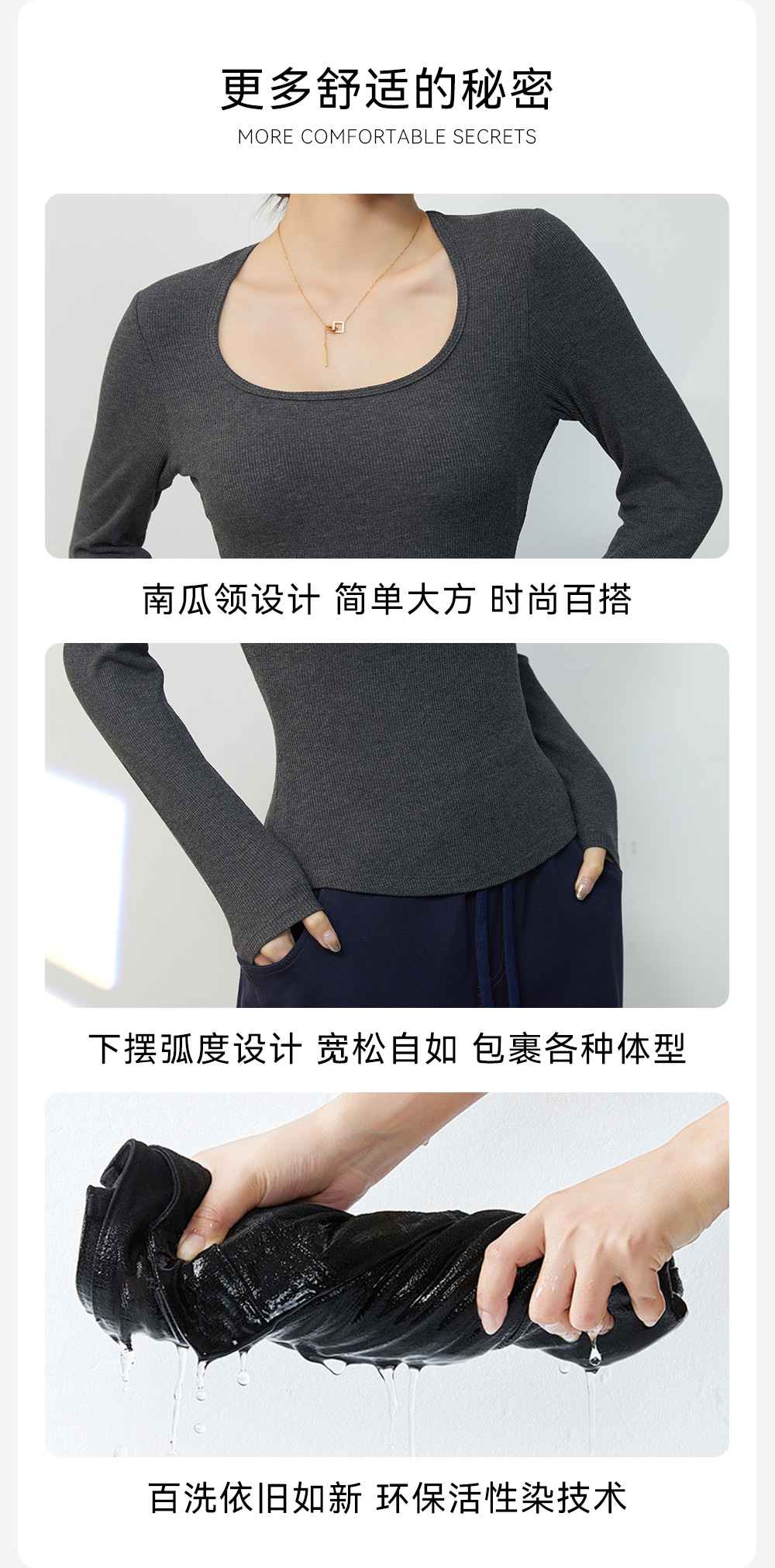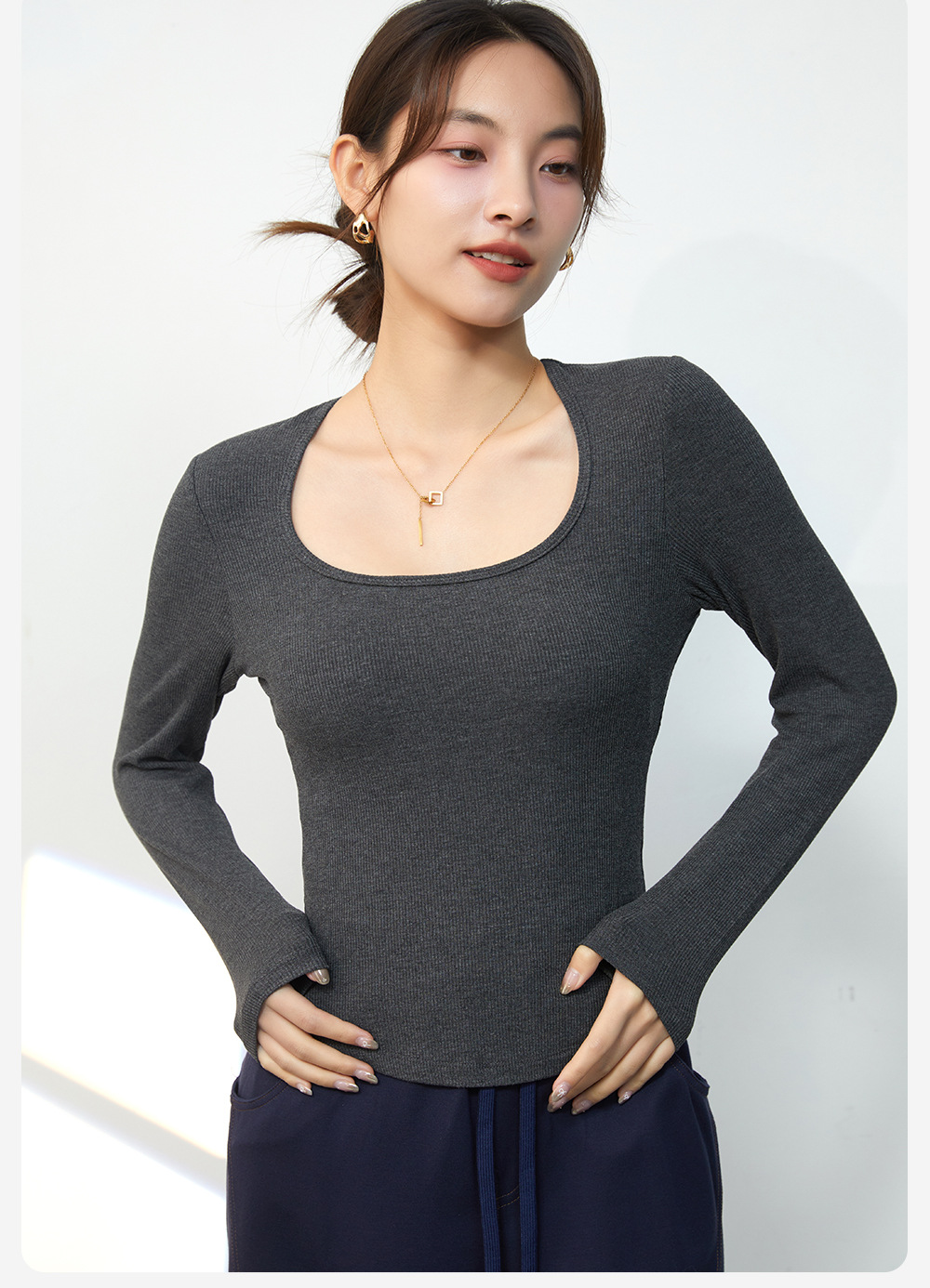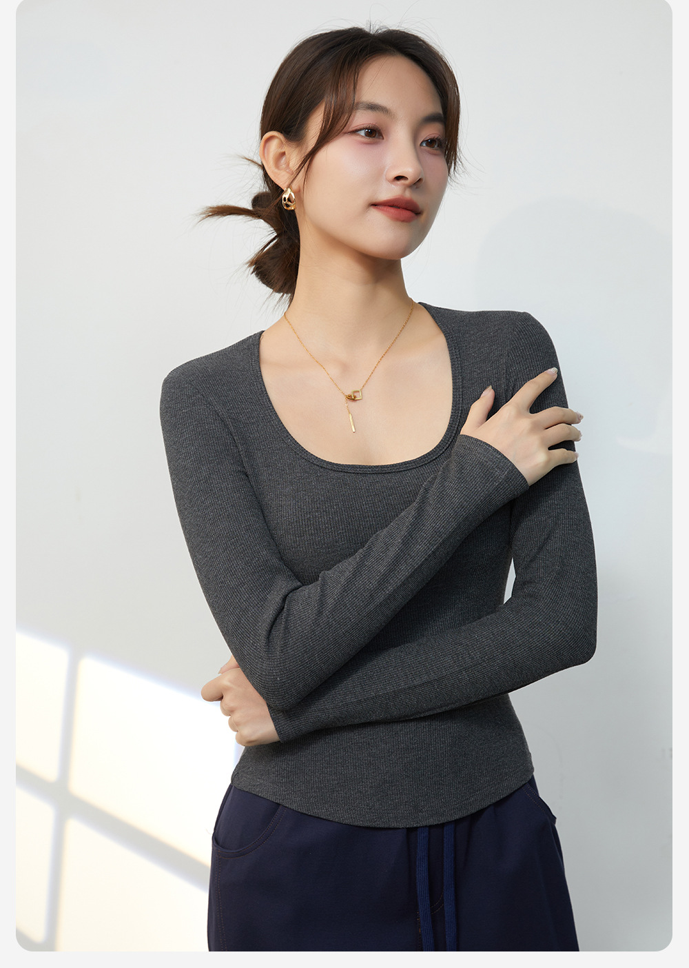 春と秋の胸付きクッションの中に丸首をかけて長袖の純色の上着を着て、体を修理してゆったりしています。