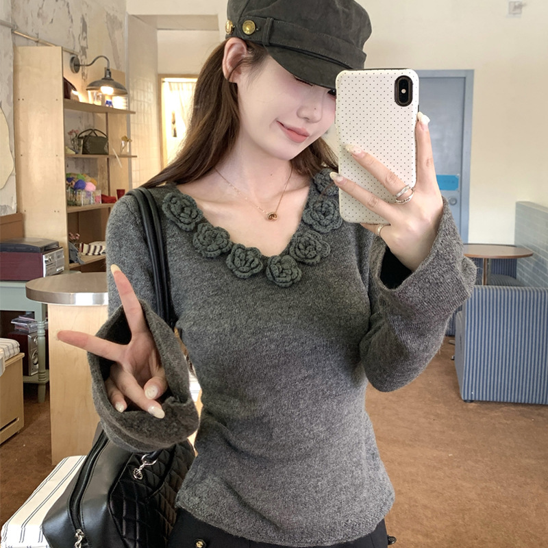 灰色针织衫女冬2025新款韩系V领立体花朵修身显瘦气质打底衫上衣