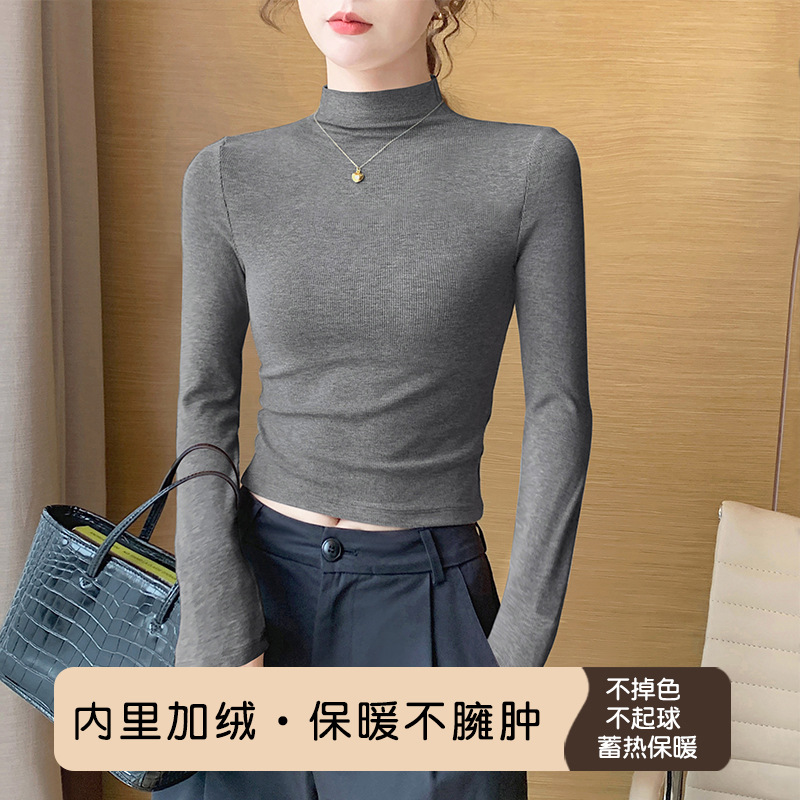 半高领打底衫女内搭秋冬修身加绒磨毛保暖小个子高腰露脐短款上衣